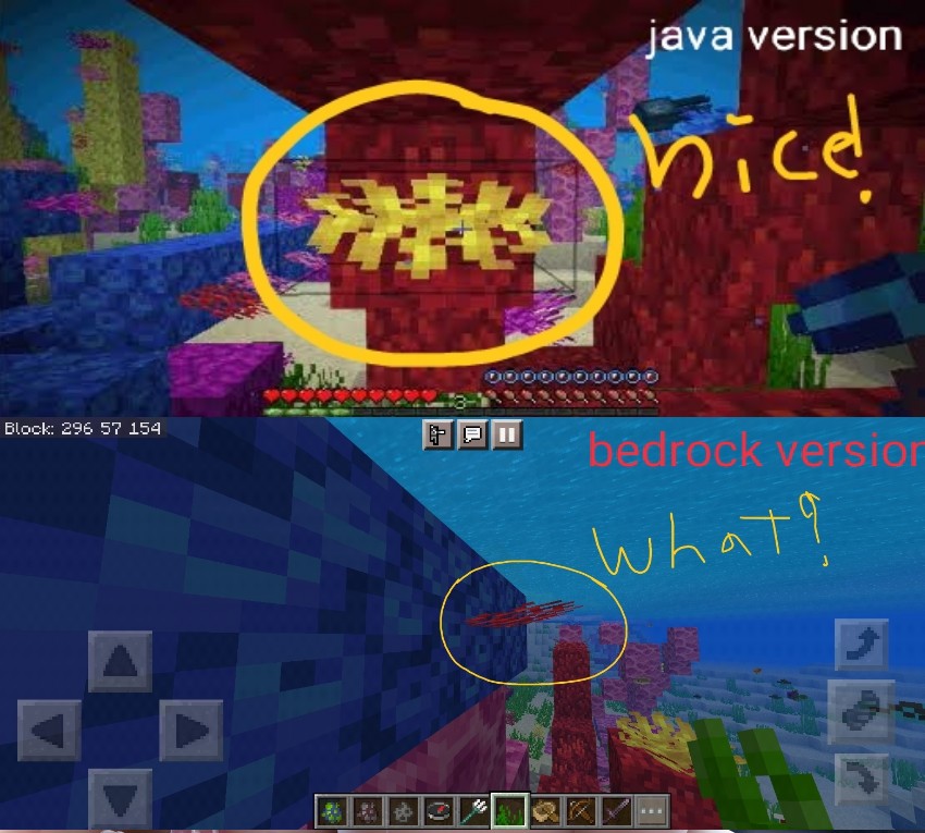 Coral fan in bedrock edition ไม่ได้แยกออกเป็น 2 snatches เหมือนใน java edition นั่นทำให้ corals in bedrock edition มันดูไม่สวยงามเท่าที่ควร