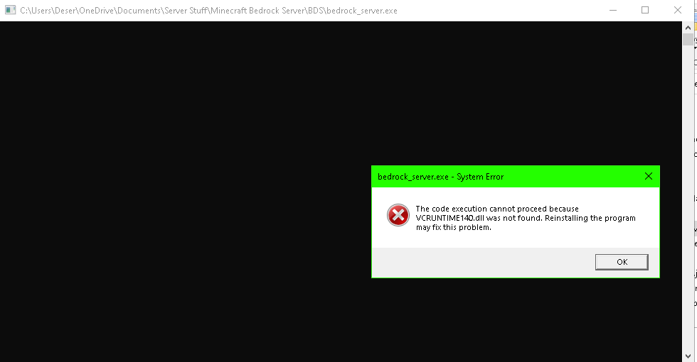 Hello. So I was setting up a server and when I went to open the .exe files, it gave me errors. It is annoying, but hopefully, it will be fixed. I have tried everything to try to fix it including copying files from my bds server (using a hosting company, Ramshard) and transferring the files to my PC. I am running Windows 10 home. Specs: