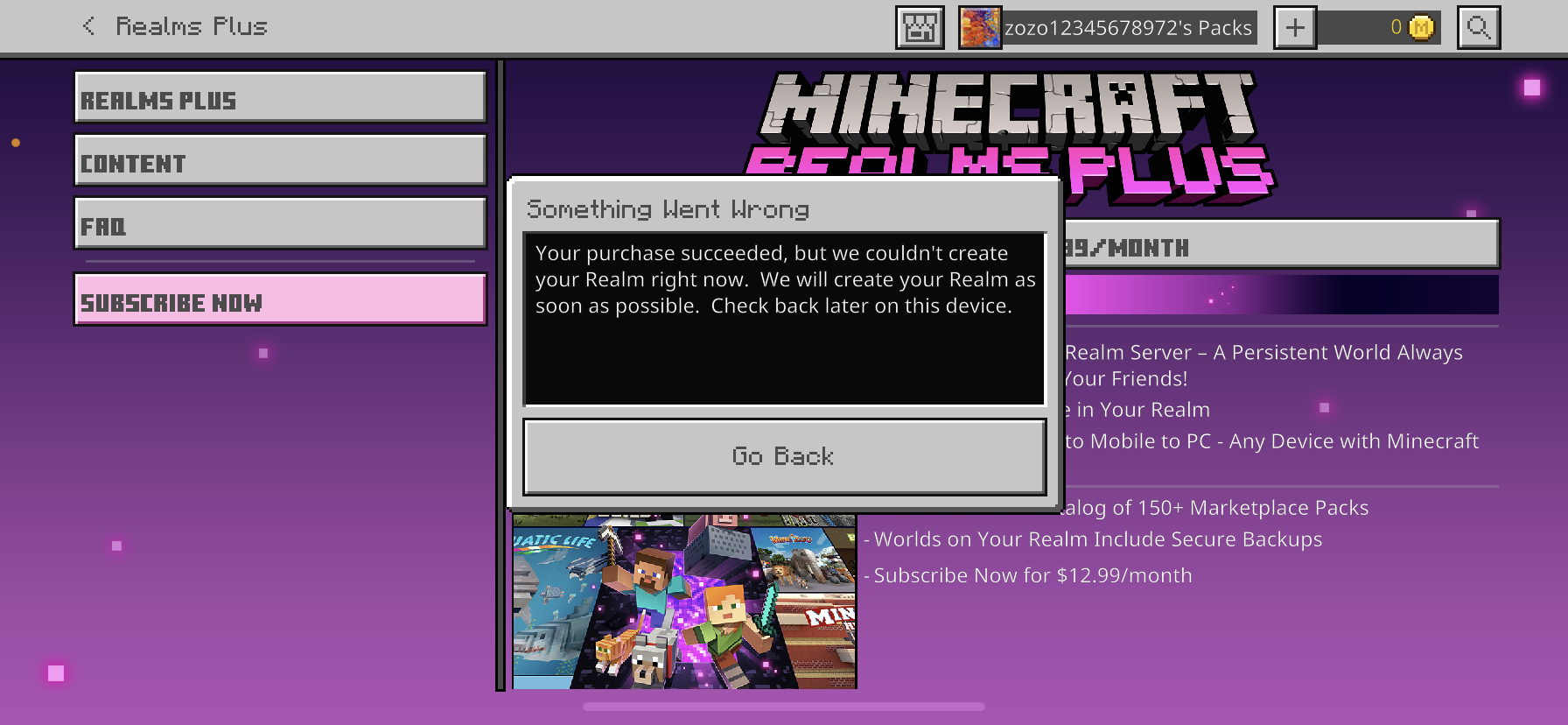 My realm which is a 10 player realm does not show up. It has been hours since it has been purchased, but it is still to appear. Whenever I try to add a 10 player realm, it continues with a bug where it says you have purchased the realm but couldn't create it. This keeps happening over and over. What can I do? Please reply back as soon as possible