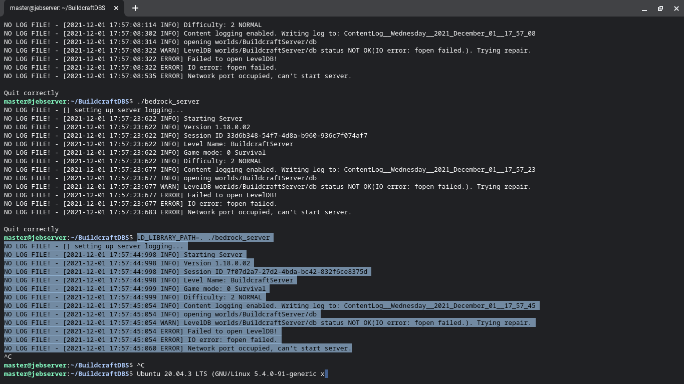 NO LOG FILE! - [2021-12-01 17:57:45:054 WARN] LevelDB worlds/BuildcraftServer/db status NOT OK(IO error: fopen failed.). Trying repair.