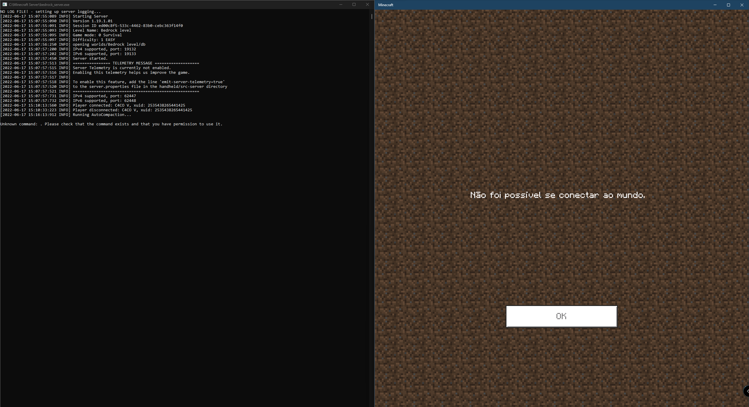 Good afternoon, I'm reporting a bug where I can't access the local server of my machine in Minecraft Bedrock, even using the command in the CMD described in the file "bedrock_server_how_to.html". Every time I try to get into the server I never can, just using the private IP and disabling the windows firewall. With Windows firewall enabled, I am not able to enter the server with either my computer's private IP or the public IP. My need to use public IP is that my friends can log in using it and not from my LAN network. I also already opened ports 19132-19133 on the router/firewall and nothing!