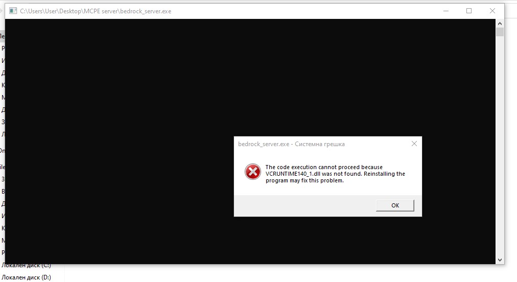i downloaded the "MINECRAFT DEDICATED SERVER SOFTWARE FOR WINDOWS" and did all of the steps for instalation, but when i start "bedrock_server" i get the error "The code execution cannot proceed becouse VCRUNTIME140_1.dll was not found. Reinstalling the program may fix this problem.". i tried to reinstall it, but it was the same thing. Can i get some help? I am in bulgaria.