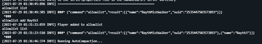 I noticed after the 1.20.11.01 BDS update that my allowlist.json files will have random playing deleted from the file. It's only happened a few times now, but last night I was online with 4 other people and this morning I looked at the file and it was only the 5 of us that were on that list when I have 15+ added to the list the night prior and no changes made between then and discovery.
