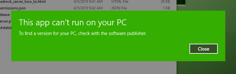 I have a PC that I'm trying to run a Bedrock server so all of my friends can play whenever they want instead of only when I can play. I downloaded the files from Minecraft.net but when I tried to run the bedrock_server.exe file my computer told me "This App Can't Run on Your PC, to find a version for your PC, check with the software publisher" I have the latest version of Java, 8 update 201, as well as the latest version of Windows 10, 1809. Could you please give me to advice on what I can do to resolve this issue?