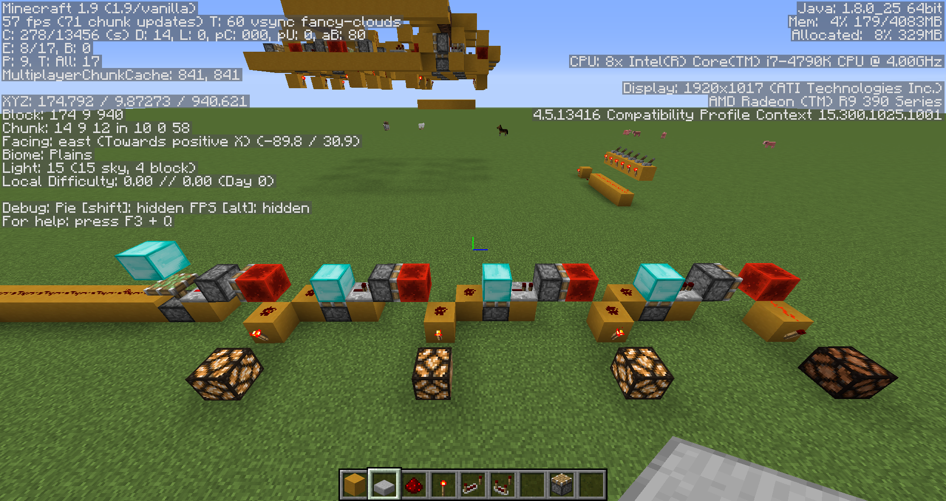 The attached images display a binary counter with a one tick pulse provided to its input. When close to the counter there is no issue, but when I move a few chunks away from it the blocks being moved by the pistons start to duplicate. This could obviously be used to create unlimited resources and poses an issue for redstone contraptions. The first image shows a clear circuit design; the second shows chunk stats; the third shows the circuit from three chunks away; the forth shows the circuit after the bug has taken place and the fifth image shows the input circuit.