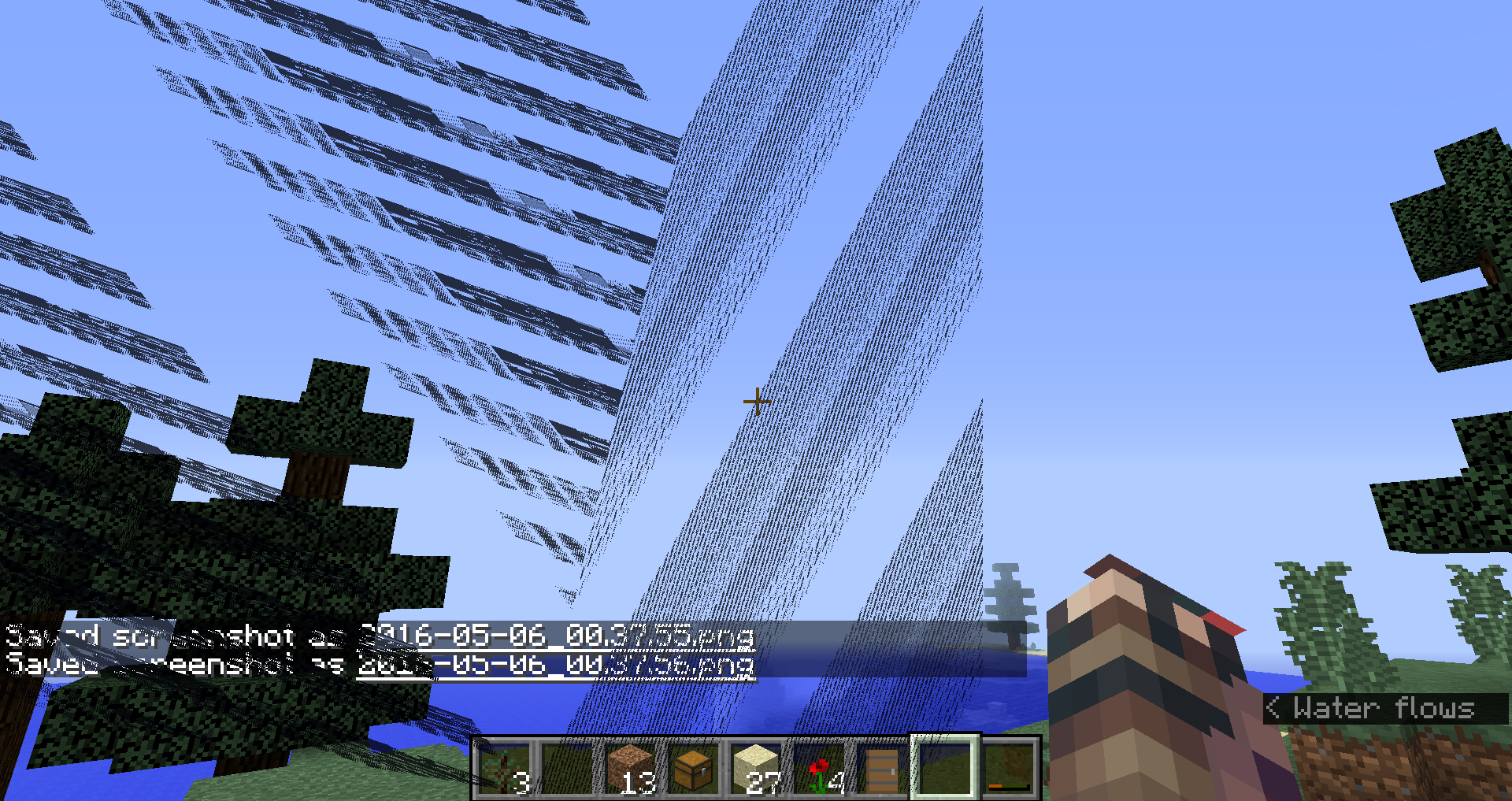 When playing minecraft I find the screen doing a weird sort of streaking across the screen at random times. It is rather distracting and annoying. I have tried giving minecraft more ram (up to 5gb) and tried changing the video settings and screen resolutions. I cannot figure out how to fix it and I need some help. Ive attached some images of what im experiencing.