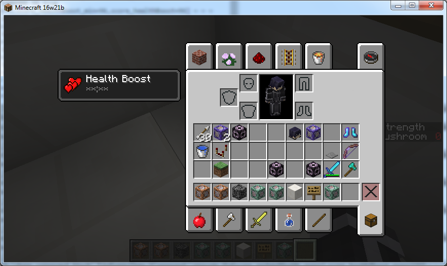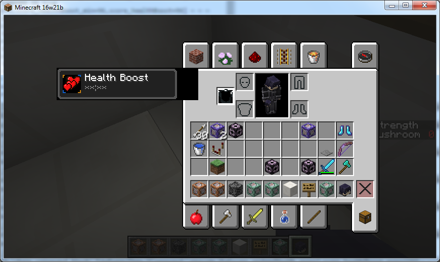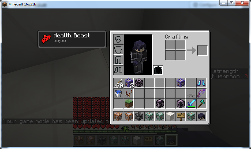 When a player's skull is placed onto the last slot of hot bar, the inventory displays black on player's offhand slot, and the status effect tag displays incorrectly(with the black on the side, this is in creative only) as well. Affects both creative and survival players, but differently (see attached images). No effect if another item placed in the last hot bar slot.