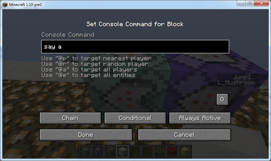 /say a/say a4. Place a block on top of the repeating command block, it gets destroyed instantly but the chain command block does not run. (Expected to see [@] a in the chatting bar)