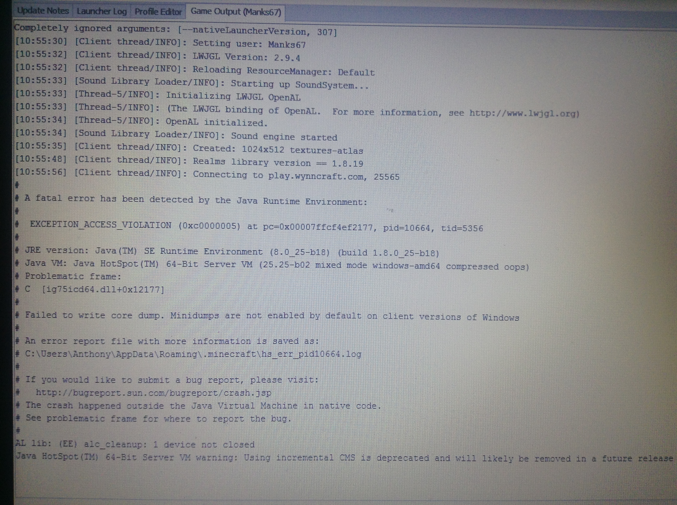 while in game for version 1.9.4 when i try to join a server it crashes and pulls up a game output report. i dont know how to read the report to fix the issue