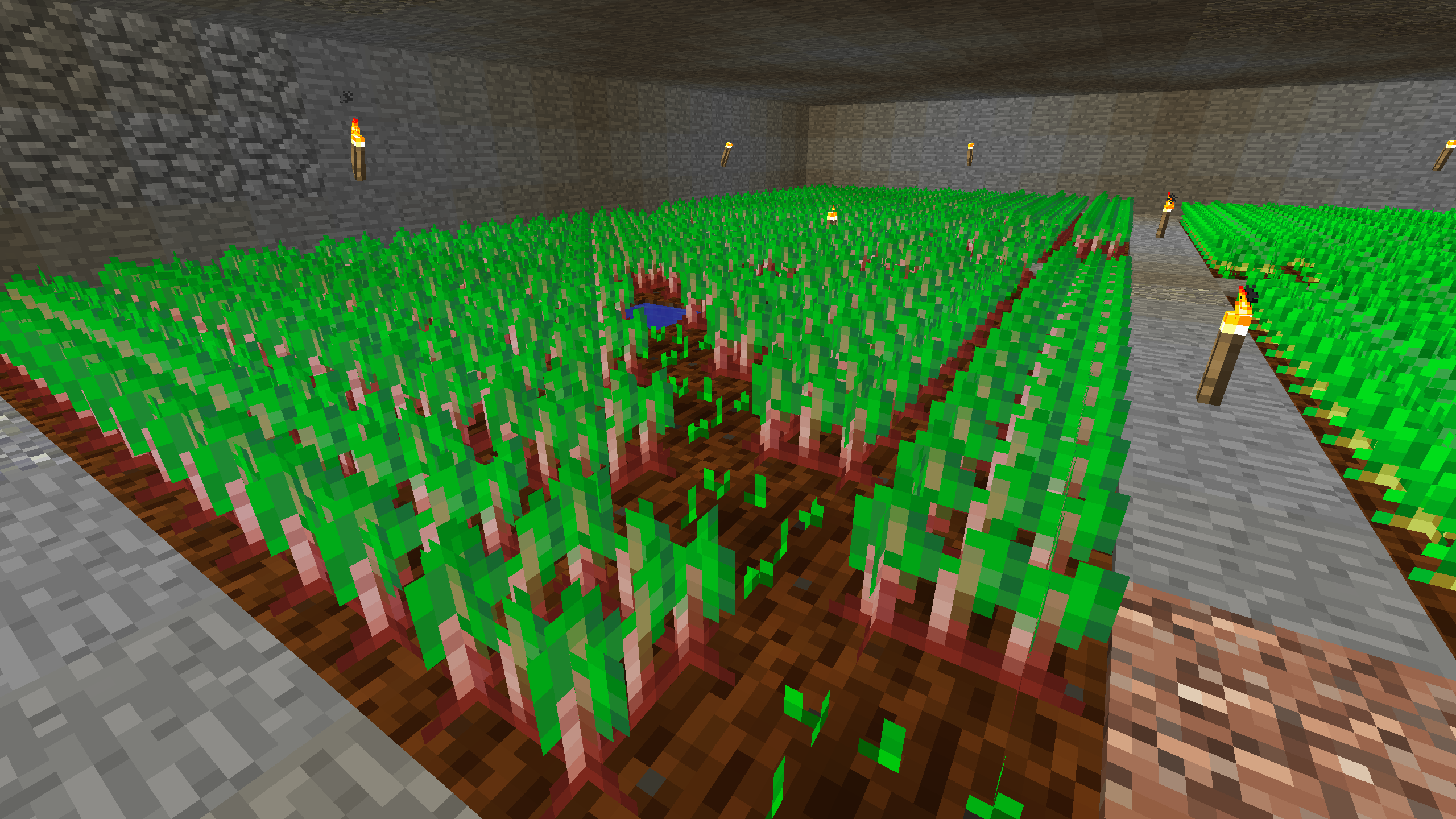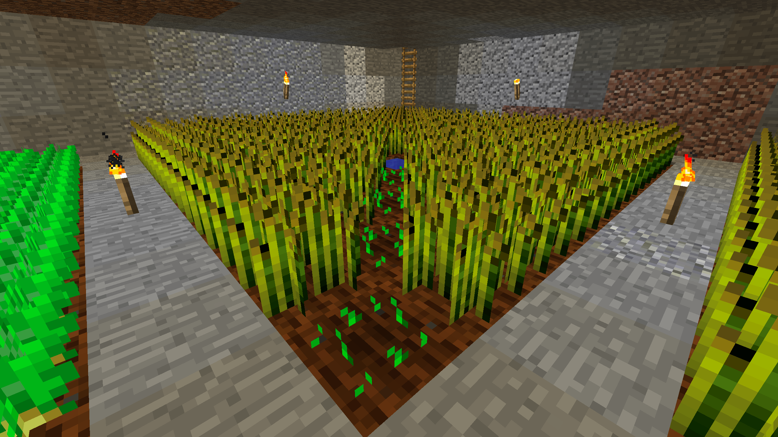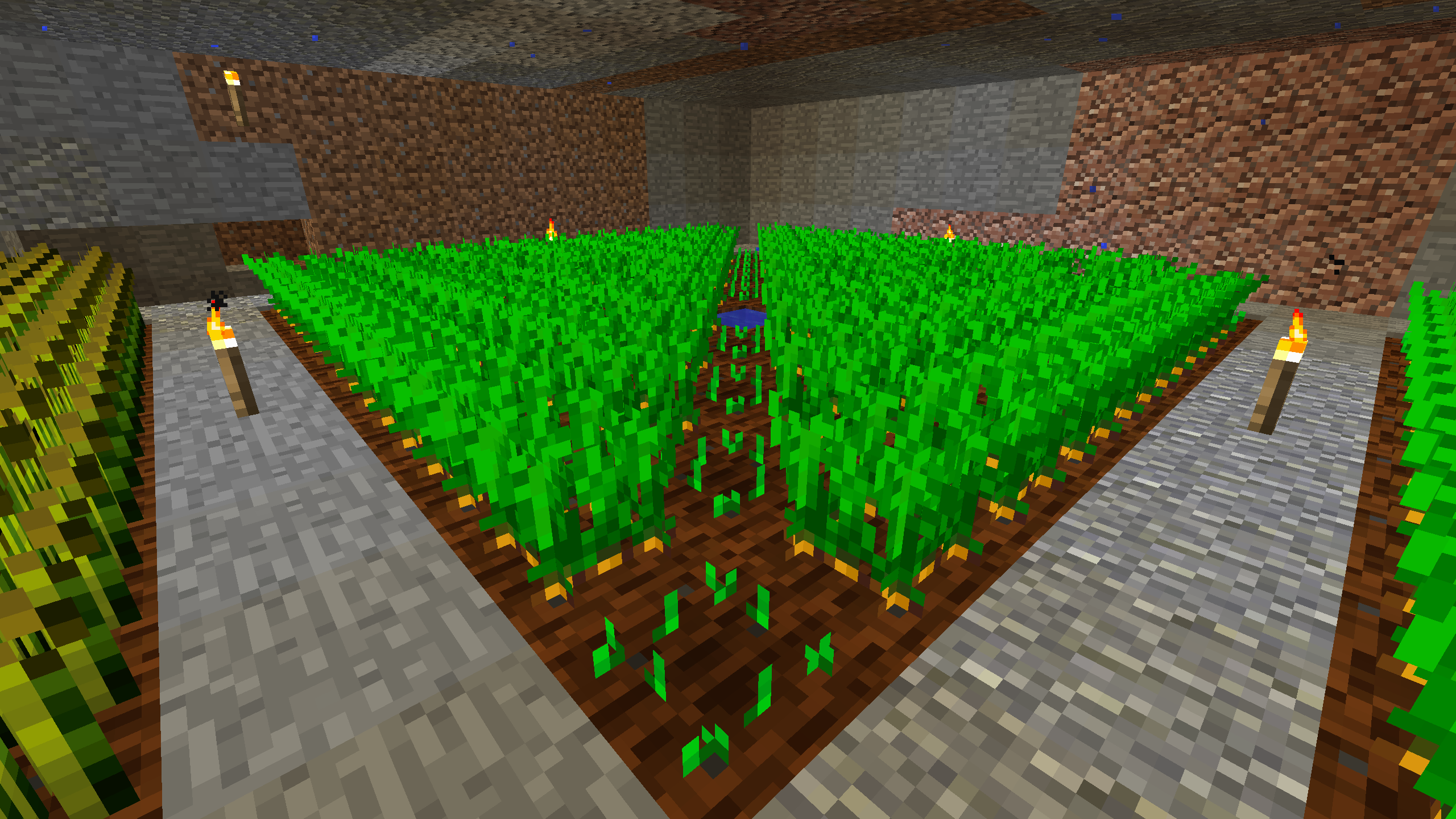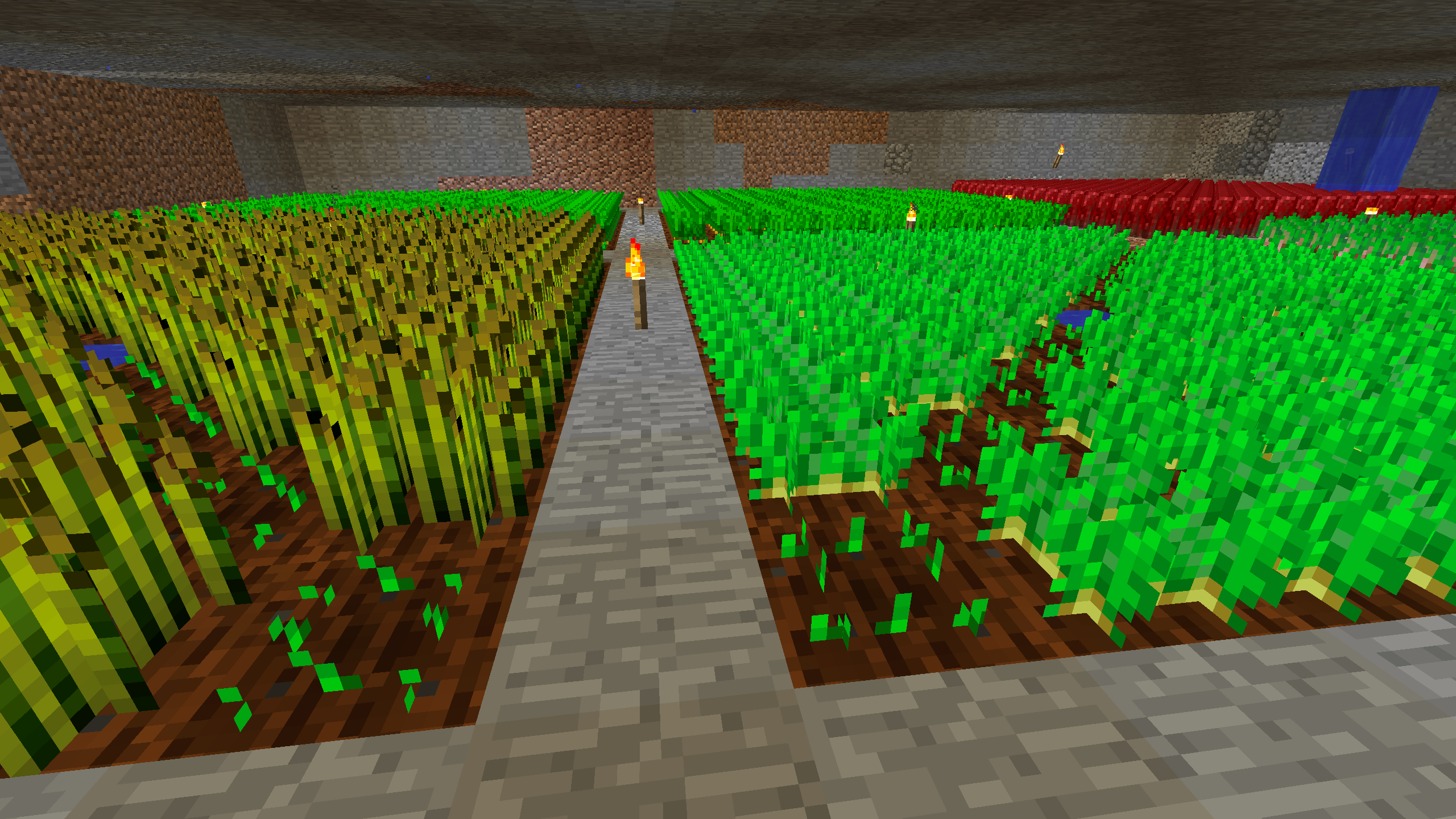 So I've been playing on my survival save for quite a while now,and I realised that some crops that I placed underground do not grow at all,and that the crops that didn't grow were all diagonally next to each other. They all extend from the water source to the end and I couldn't find any pattern of the ungrown crops.
