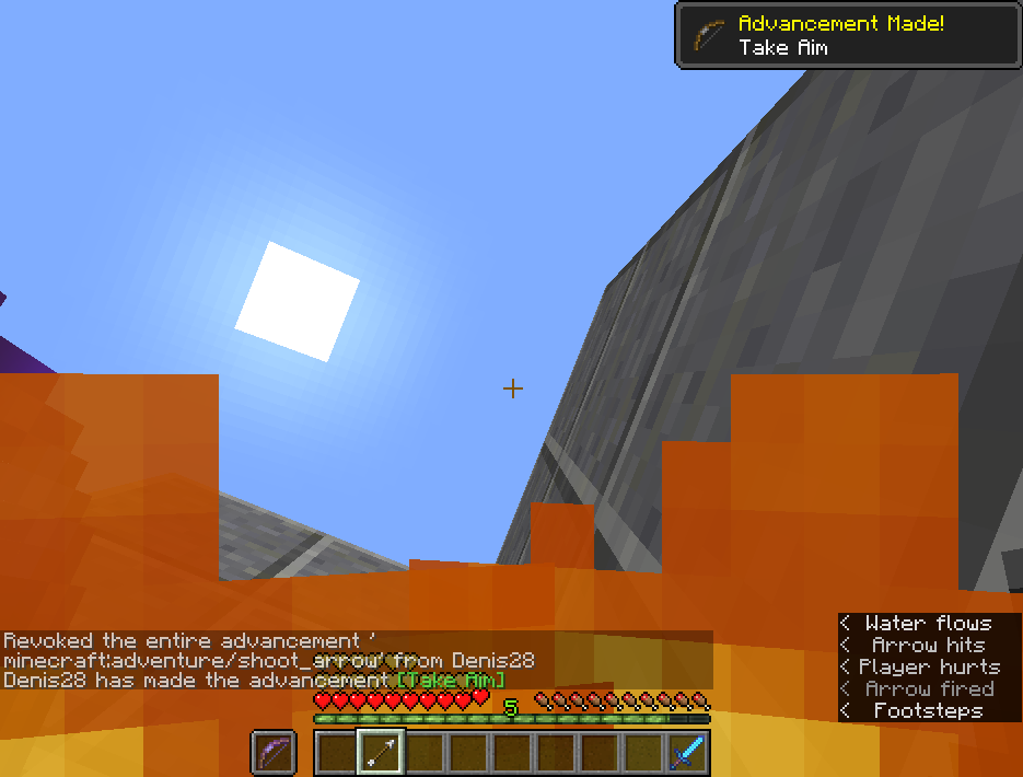 /advancement revoke @p only minecraft:adventure/shoot_arrow/advancement revoke @p only minecraft:adventure/shoot_arrowShoot an arrow at yourself, aiming upwards.