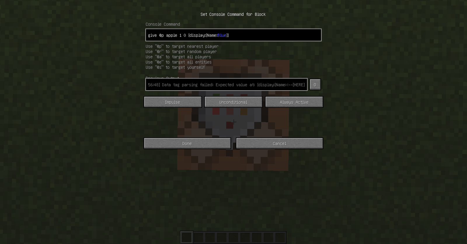 /setblock ~-1 ~ ~ wall_sign 4 replace {Text2:"{\"text\":\"\",\"clickEvent\":{\"action\":\"run_command\",\"value\":\"/blockdata ~1 ~ ~ {auto:0,Command:\\\"give @p apple 1 0 {display:{Name:\\u00a79Blue\\u00a7r}}\\\"}\"}}",Text3:"{\"text\":\"\",\"clickEvent\":{\"action\":\"run_command\",\"value\":\"/blockdata ~1 ~ ~ {auto:1}\"}}",Text4:"{\"text\":\"\",\"clickEvent\":{\"action\":\"run_command\",\"value\":\"/setblock ~ ~ ~ air\"}}"}/setblock ~-1 ~ ~ wall_sign 4 replace {Text2:"{\"text\":\"\",\"clickEvent\":{\"action\":\"run_command\",\"value\":\"/blockdata ~1 ~ ~ {auto:0,Command:\\\"give @p apple 1 0 {display:{Name:\\u00a79Blue\\u00a7r}}\\\"}\"}}",Text3:"{\"text\":\"\",\"clickEvent\":{\"action\":\"run_command\",\"value\":\"/blockdata ~1 ~ ~ {auto:1}\"}}",Text4:"{\"text\":\"\",\"clickEvent\":{\"action\":\"run_command\",\"value\":\"/setblock ~ ~ ~ air\"}}"}Then an error will come out