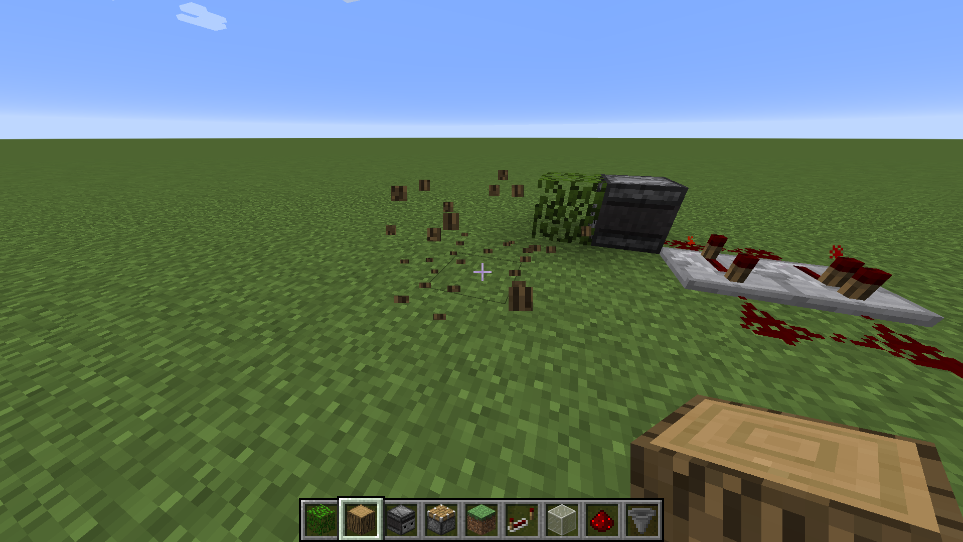 Not easily appreciated in the screenshot, but last particles of the log breaking and redstone activation are still visible.