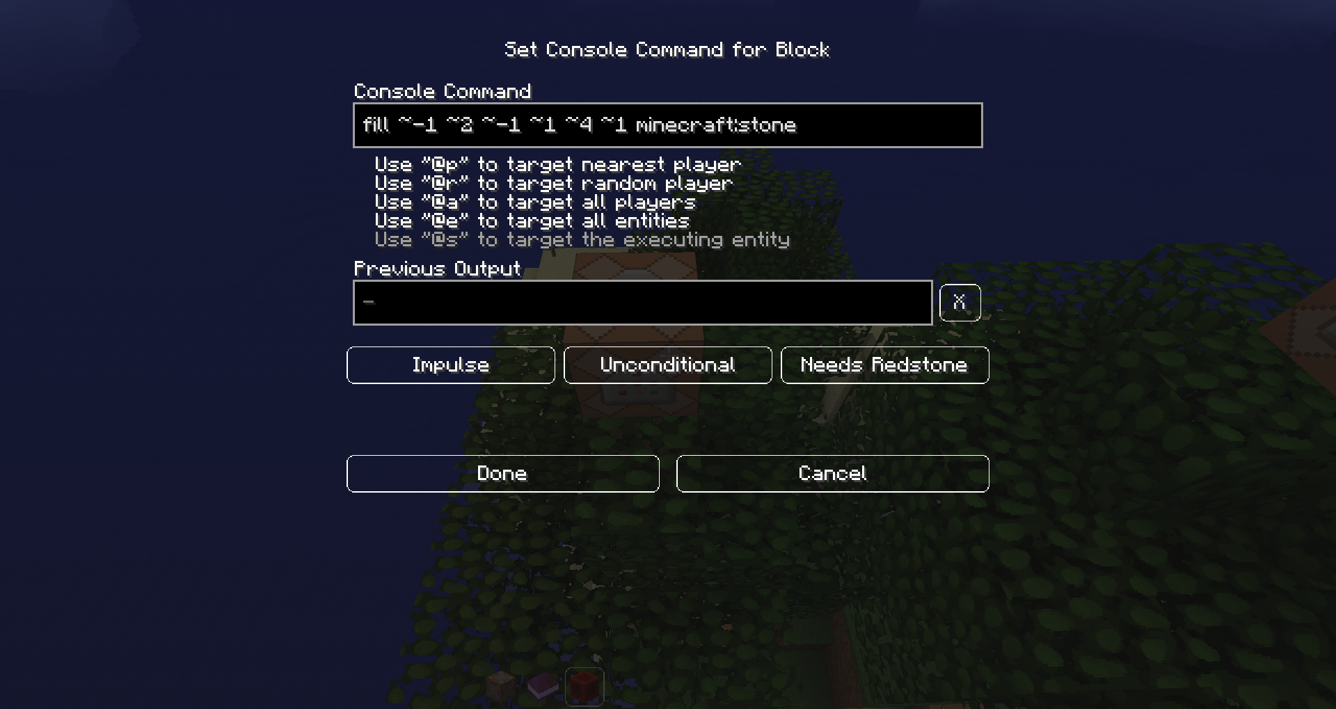 This bugpost is not about forcing success if you /setblock or /fill an already-existing block( s ), but about changing the somewhat imprecise error message "The block couldn't be placed." (Since 17w46a: ) "Could not set the block.".