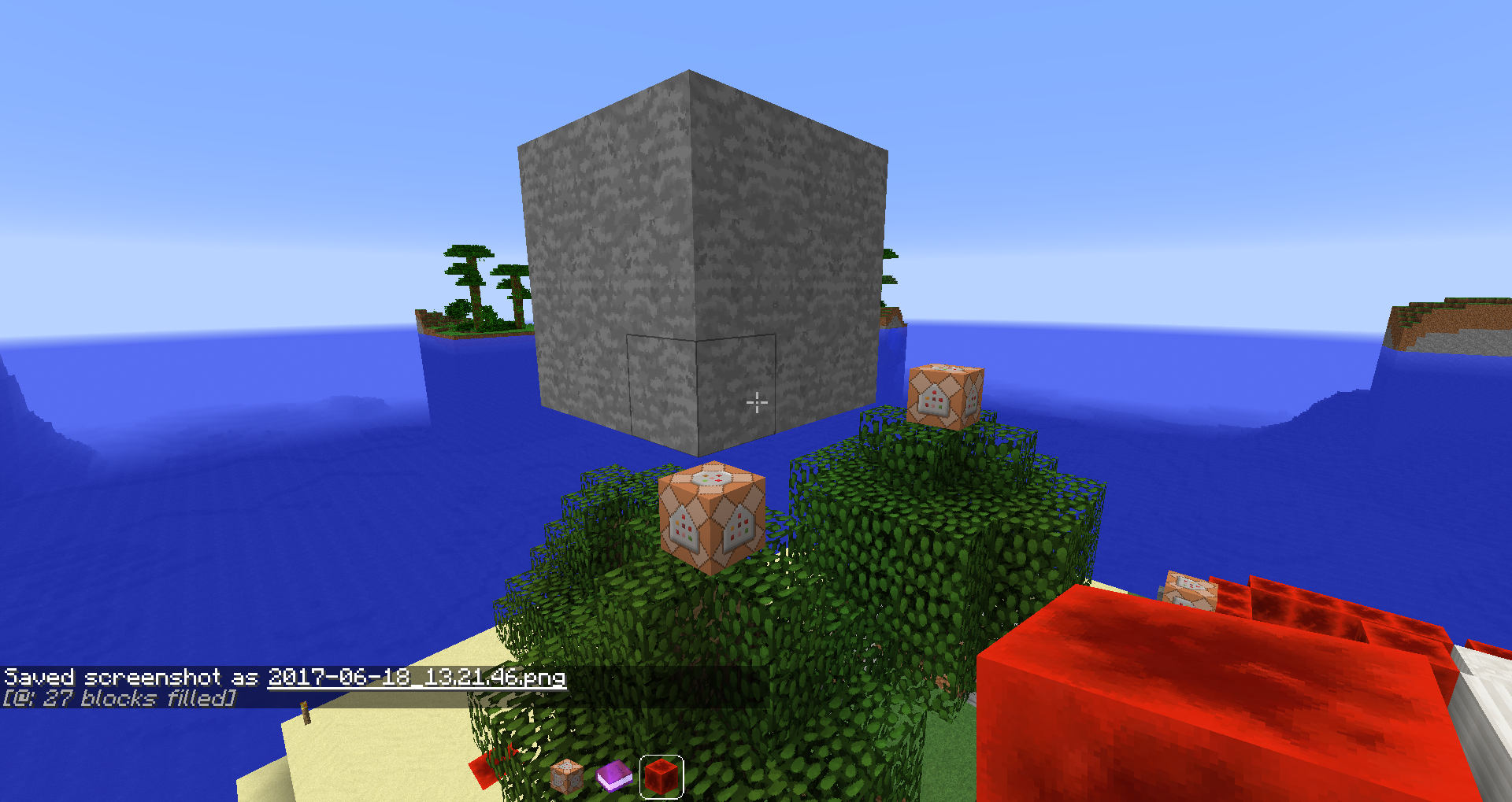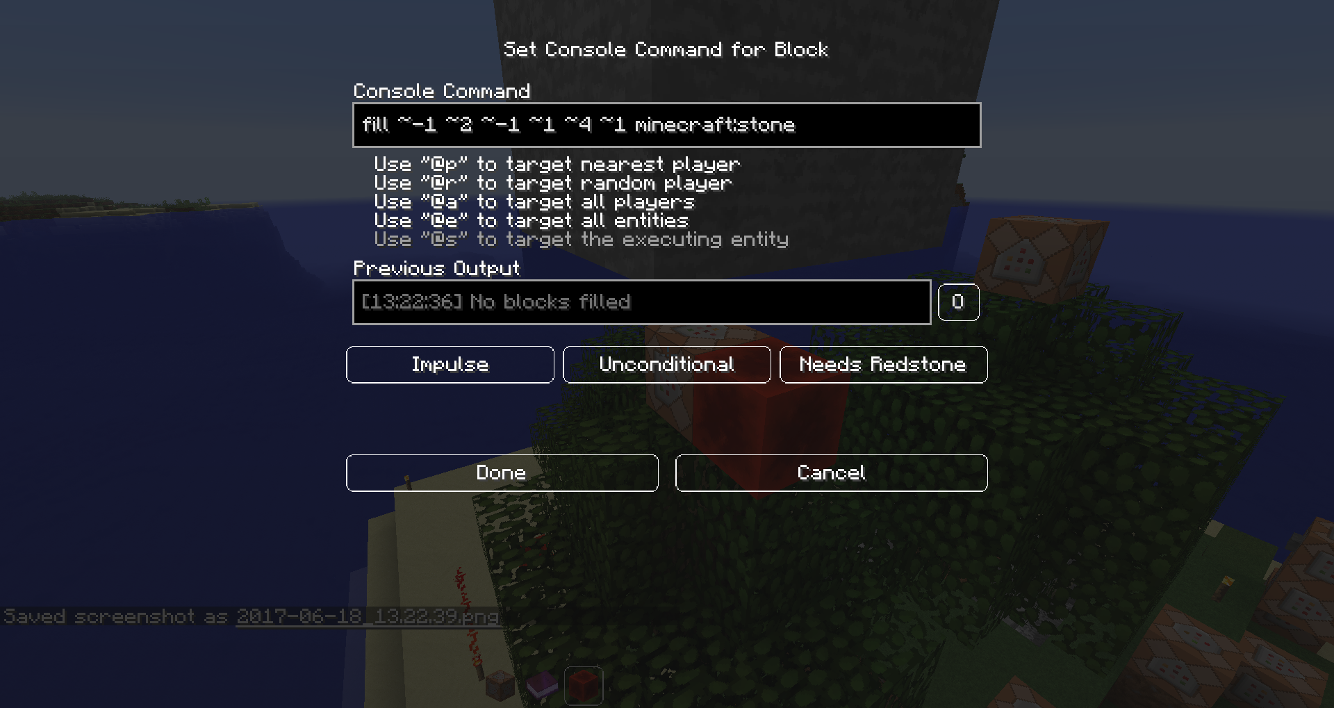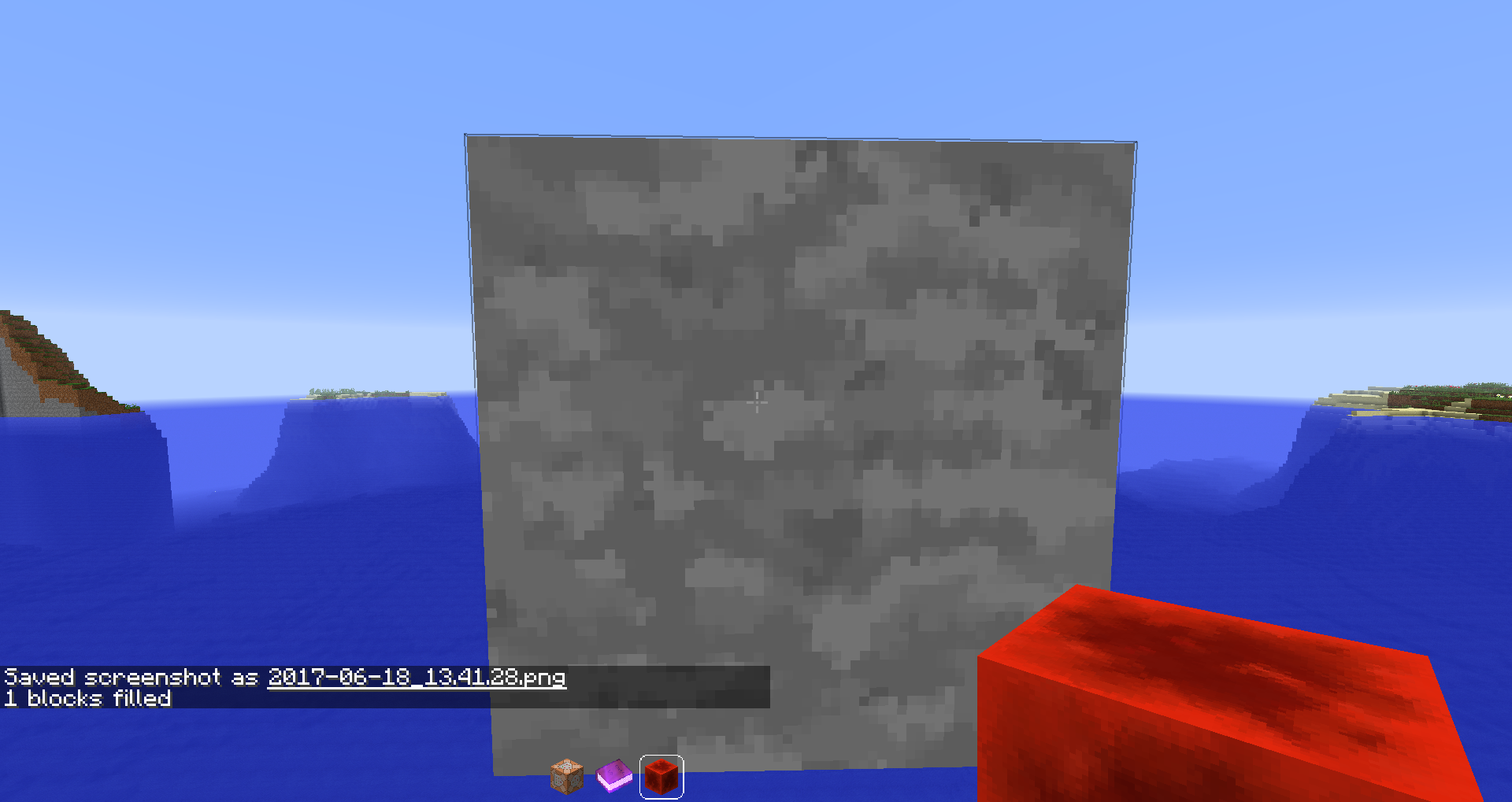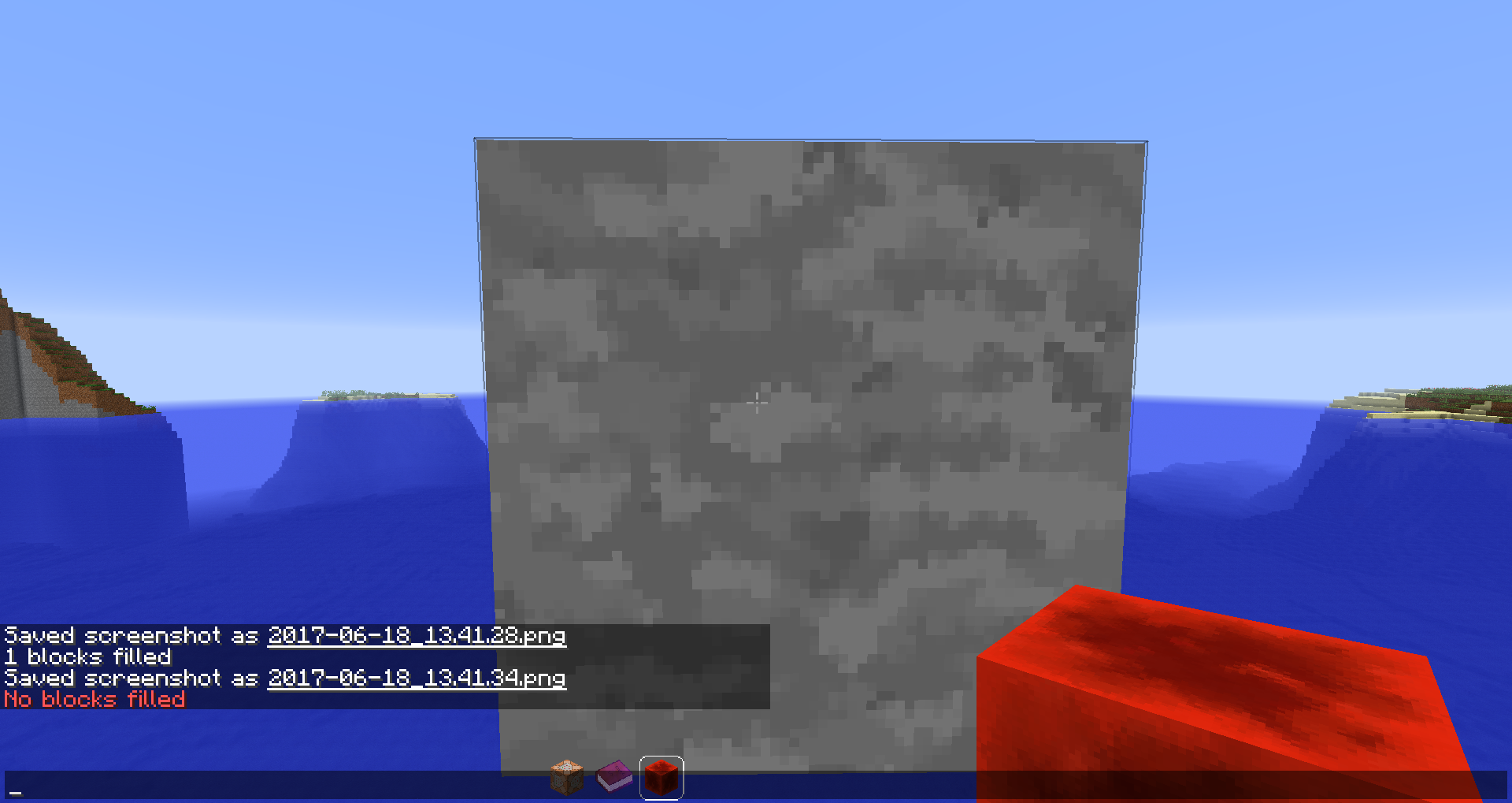If you try to fill just a single block that you already filled before with stone, again with stone, you get a different error message displayed in chat than the /setblock-error message: "No blocks filled."