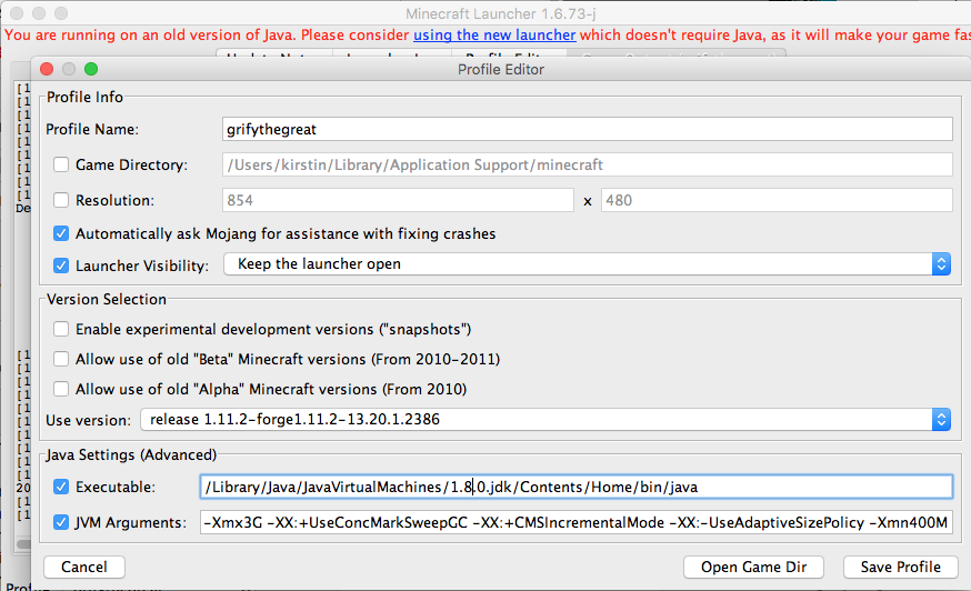 When I updated Java (I have reinstalled it 4 times now) The launcher continued to say "You are running an old version of Java". I messed with the executable files, I guess I made a mistake. Attached among the screenshots is one of the launcher setup. When I press "Play" the blue line runs to the right and... Nothing. No log, just doesn't appear. And when I quit and reopen, the launcher itself while booting says java.version == 1.6.0_65 and nothing about Java 8. Please look into this, and if this turns out to be any kind of reason that you will not actually give me a fix for it, please just give me a fix. I mean, for heavens sake, my primary source of income is my Minecraft server which I can no longer join, edit, update, or even view.