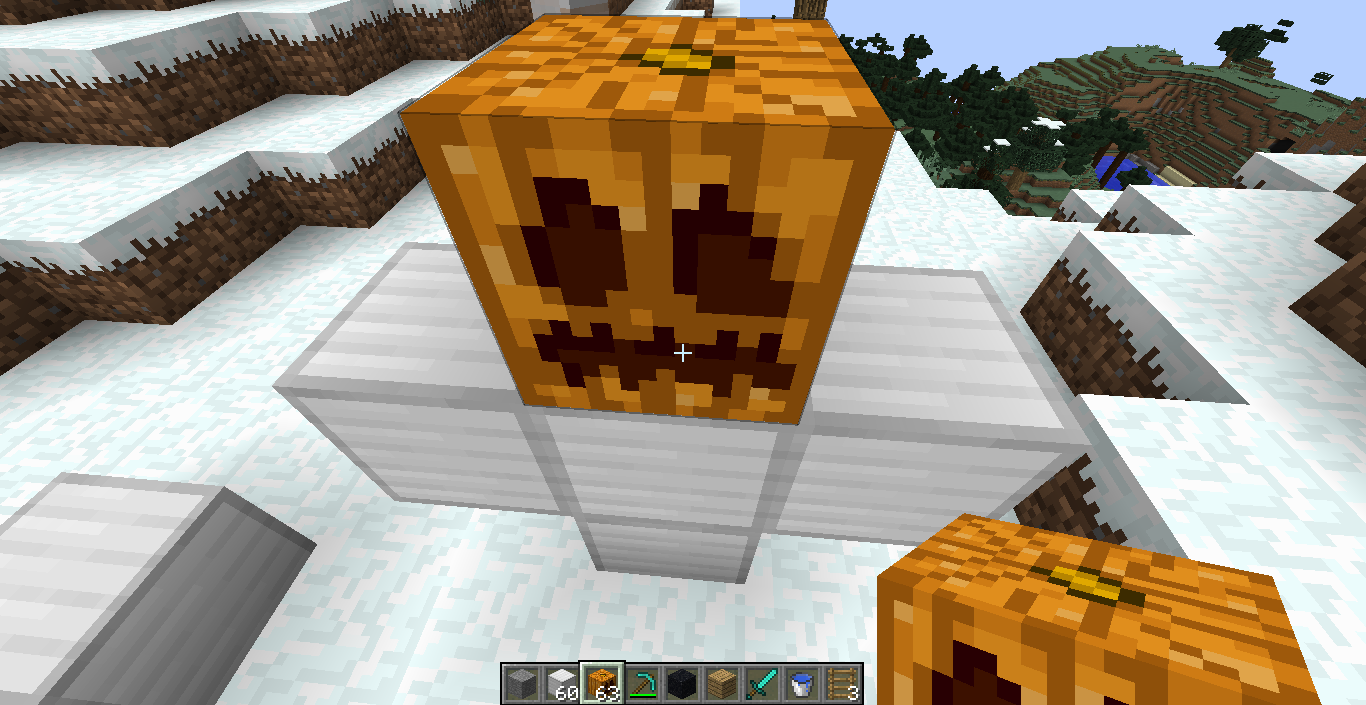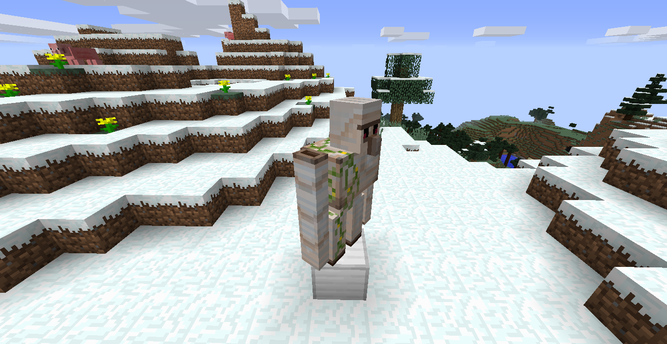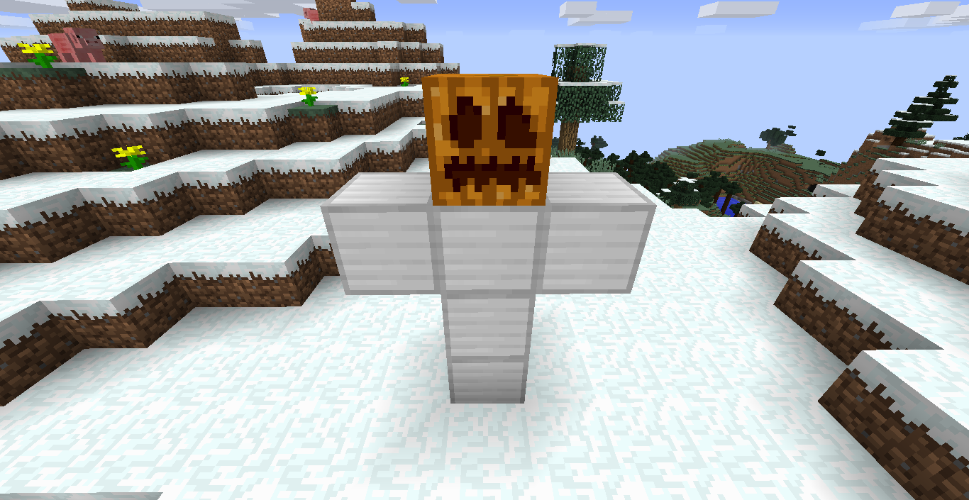 Snow Biome, Iron Golem won't spawn except with three vertical and two horizontal iron blocks. When made, it stands on the third block. Best just look at the pics attached.
