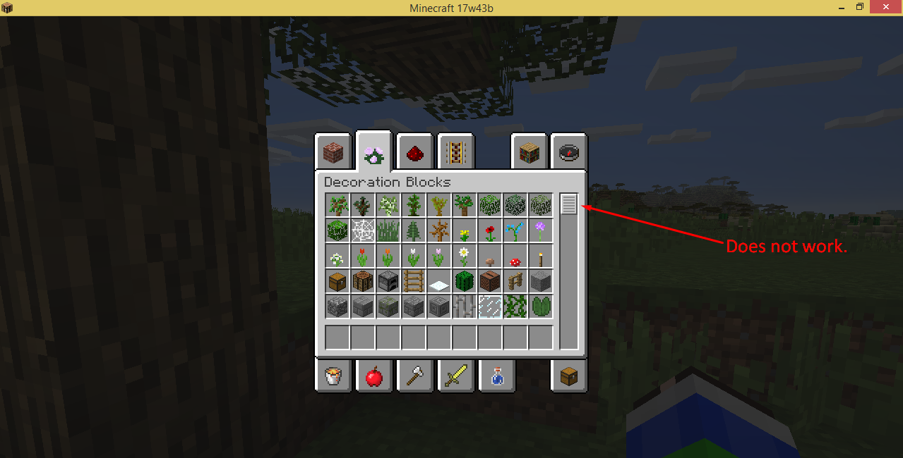 Trying to scroll by dragging the scroll thing on the right side in the creative menu does not work