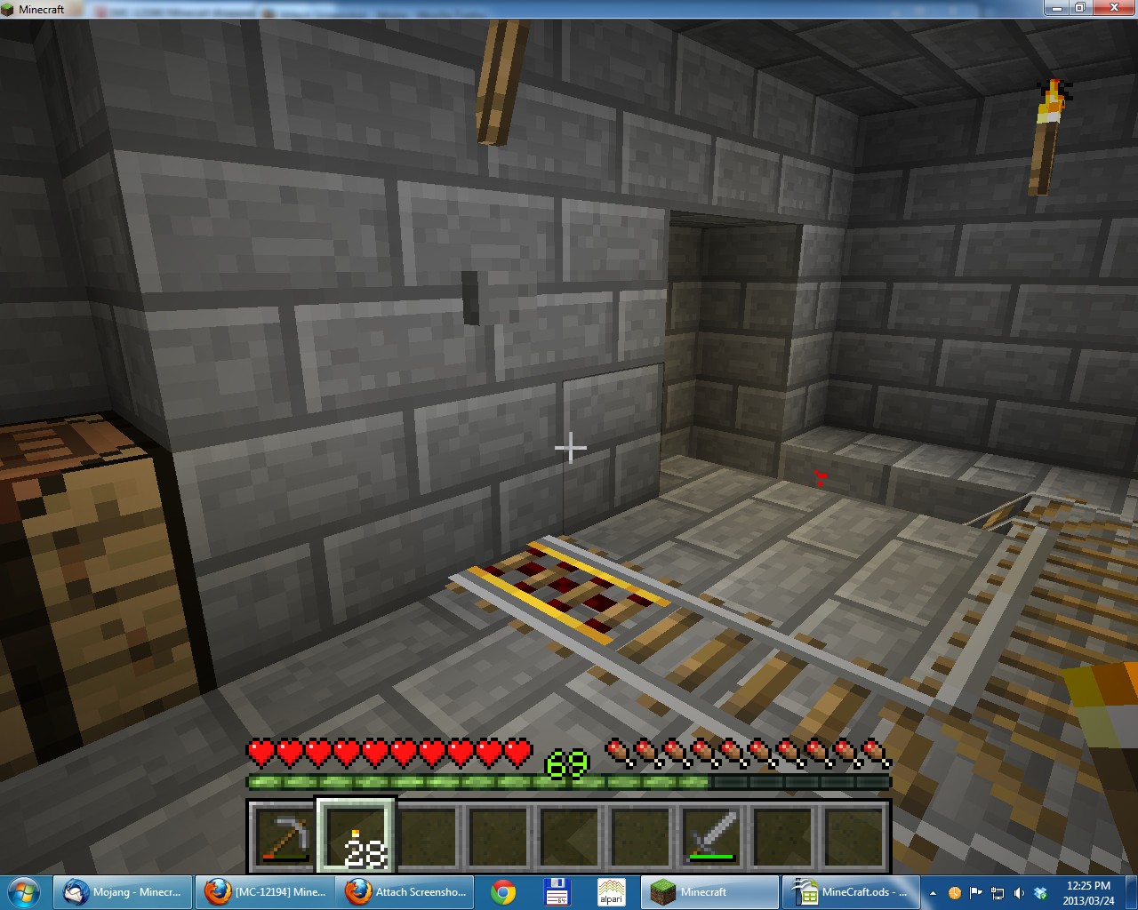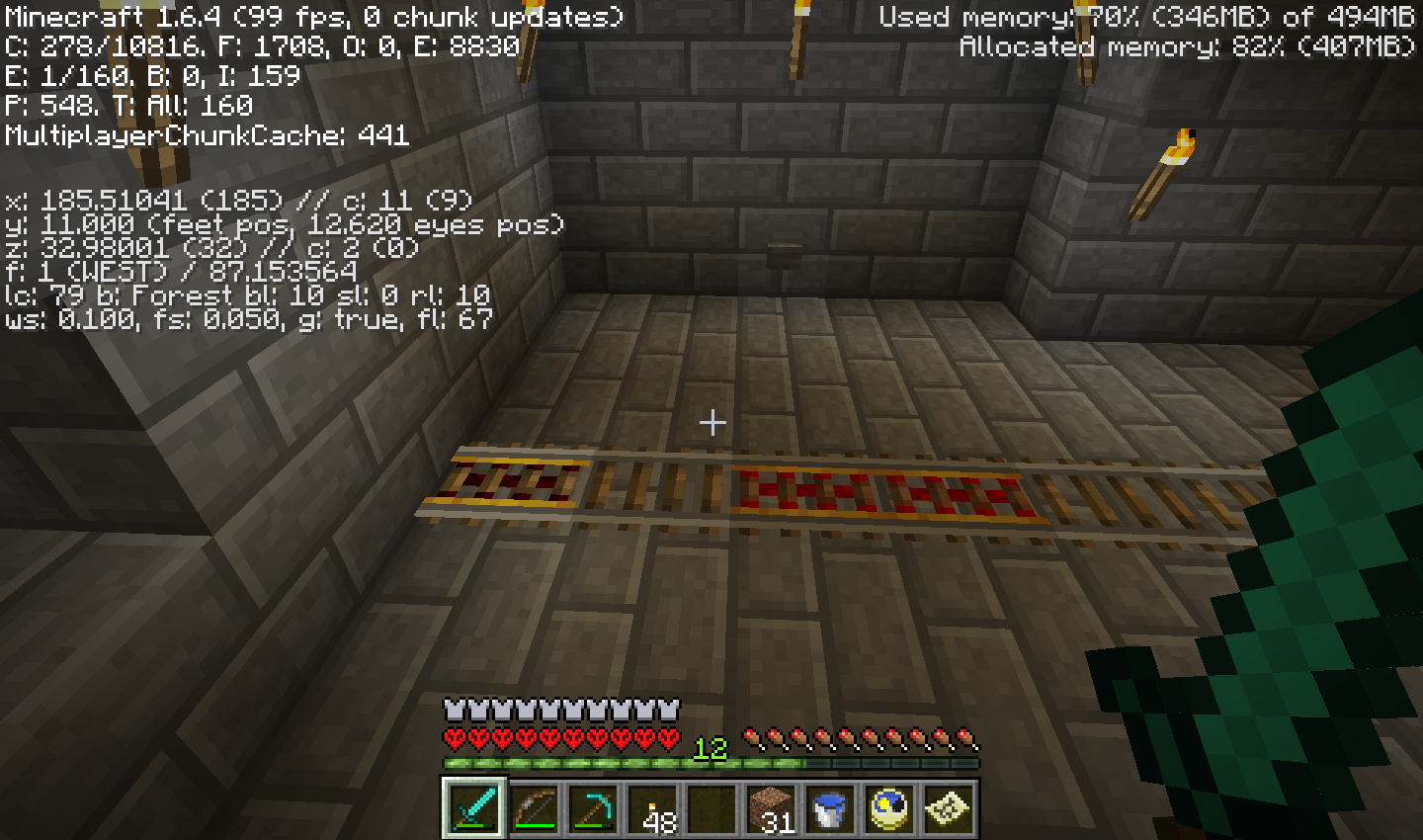 Minecart sitting on powered down track. The powered section it two blocks long. To the left and right there are powered up sections, so when I need to go I just jump in and push it onto one of the powered up sections.