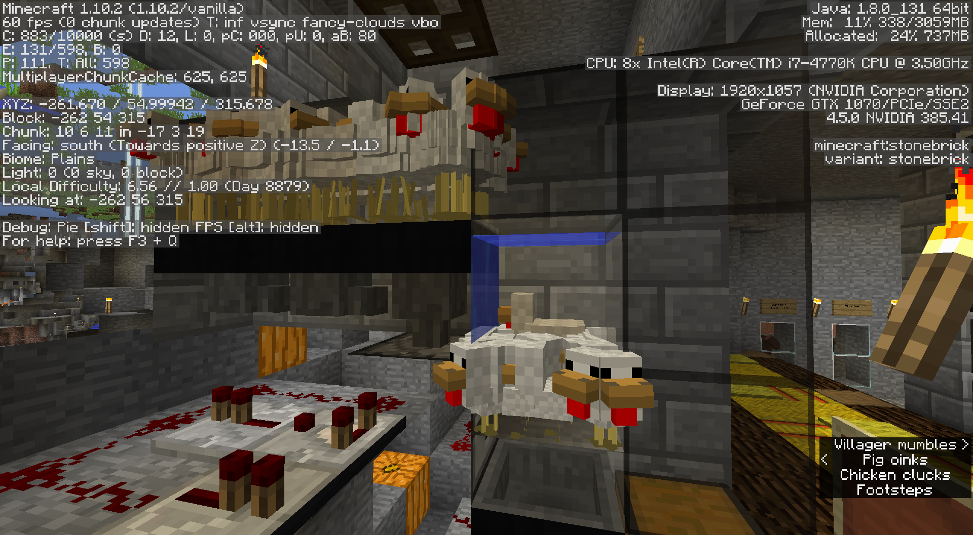 I made a raw chicken trap. A dispenser shoots the eggs into a bottom slab and when the chickens grow up they should suffocate in the water block above. Not so in the latest snapshots. Notice chickens are also occupying the same block as the hopper behind the water. I'm not sure if this is related or a separate issue.