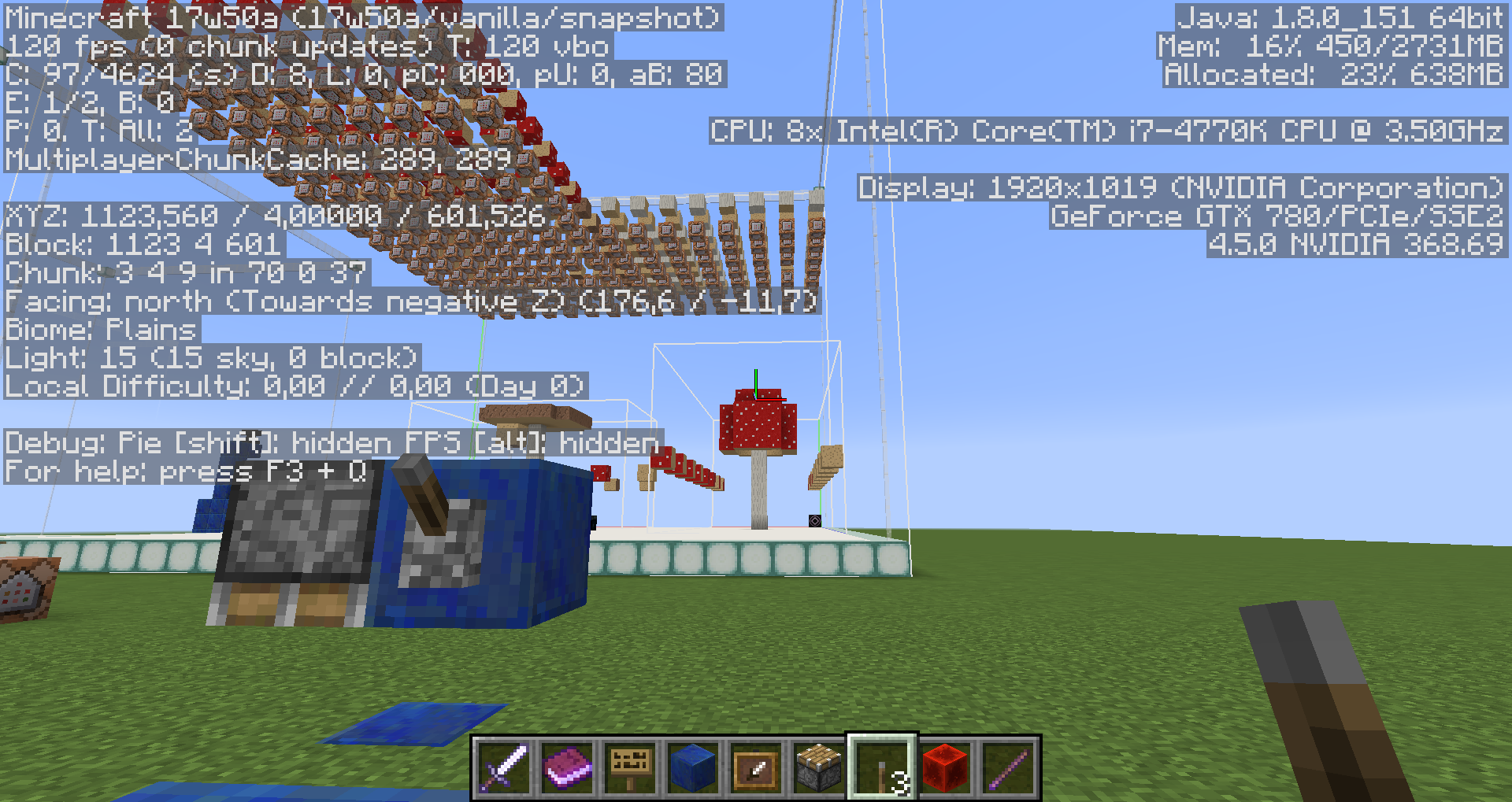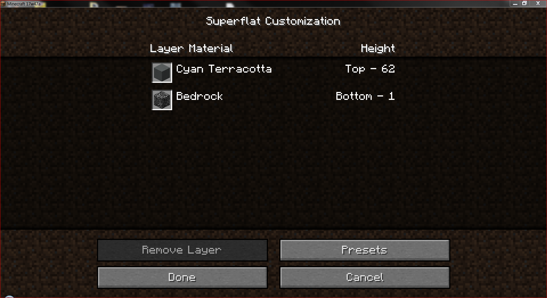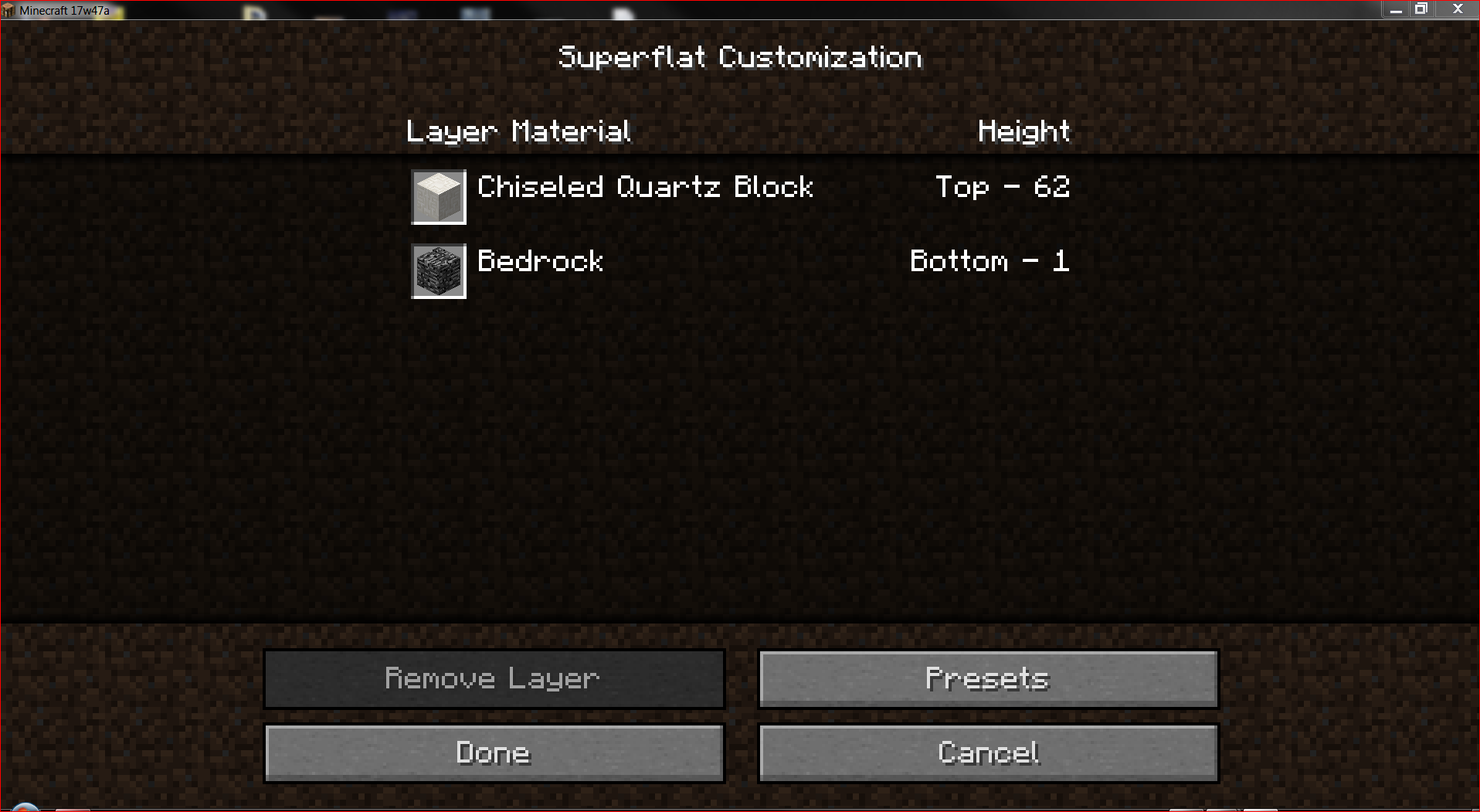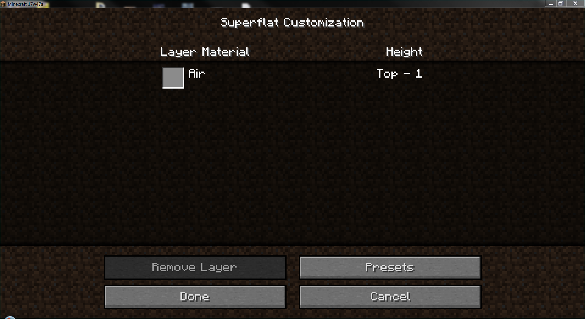 Apparently the game deleted all blocks and just sets "Air", so if I try to re-create that grassy flatland world in 47a there are of course no blocks. But it is definitely a grassy flatland world with Plains biome when I enter it (and how I created it), although it shows me upon re-creation even in 17w50a that it only would contain "Air". I did not downgrade that world though, or my blockstate-mushrooms would have vanished (I think they would have at least, haven't tested).