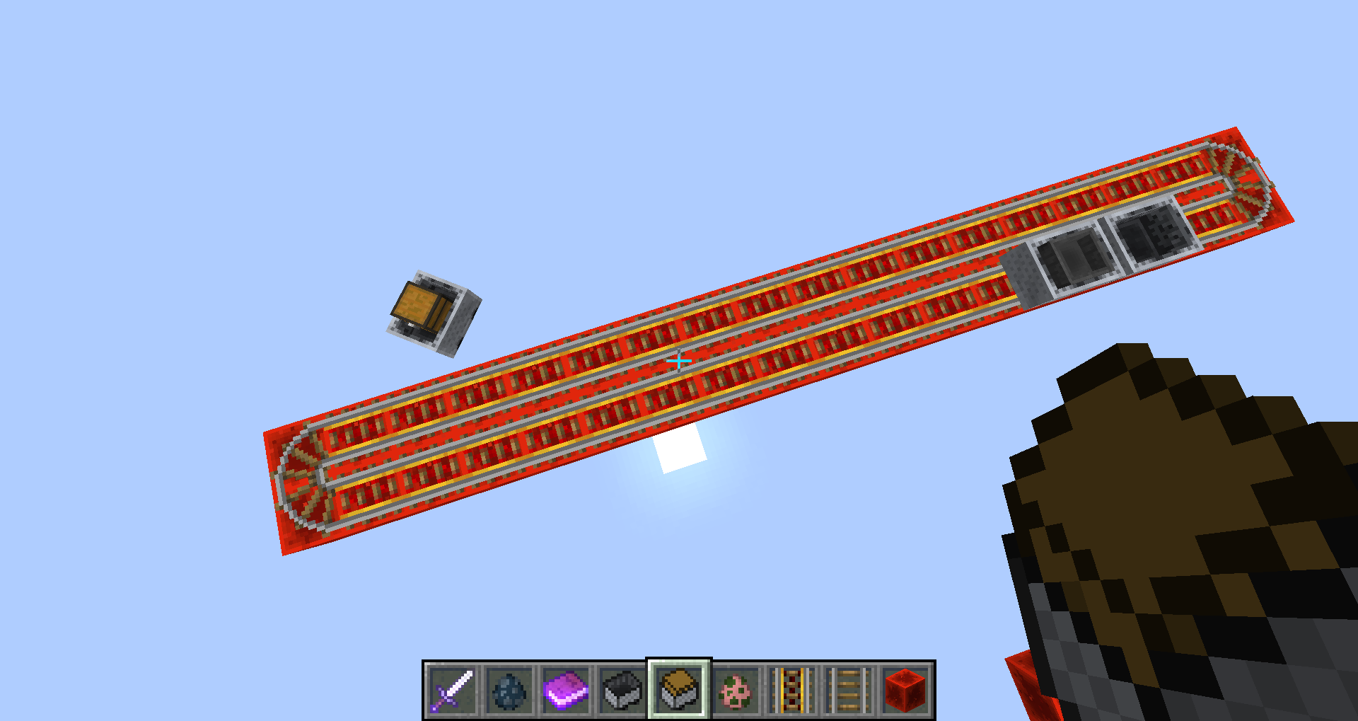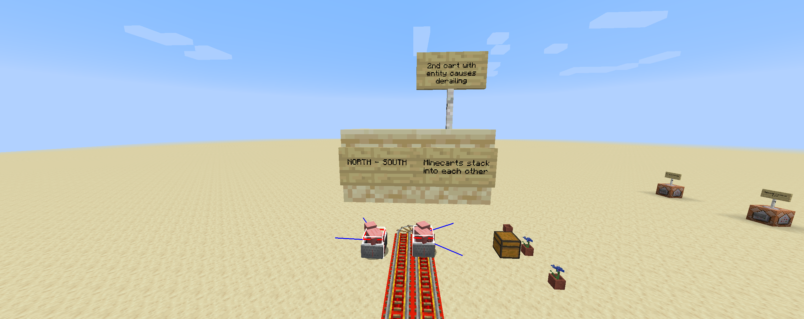 Note that in the test track the 2 rail lines got no gap between them, which could maybe cause an interference between the minecart's and some entities' hitboxes.
