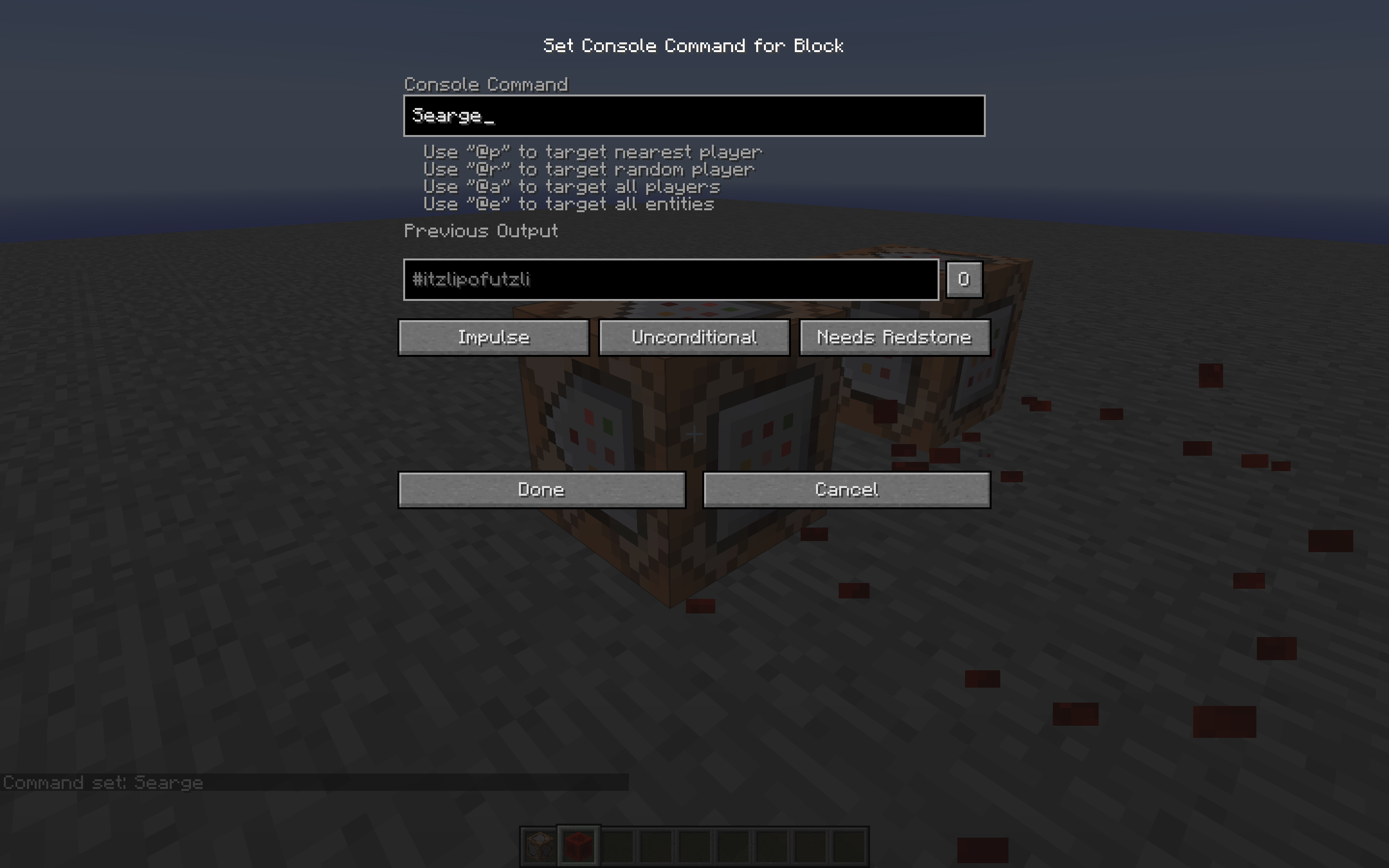 Running "Searge" as the command in the command block set the previous output as #itzlipofutzli