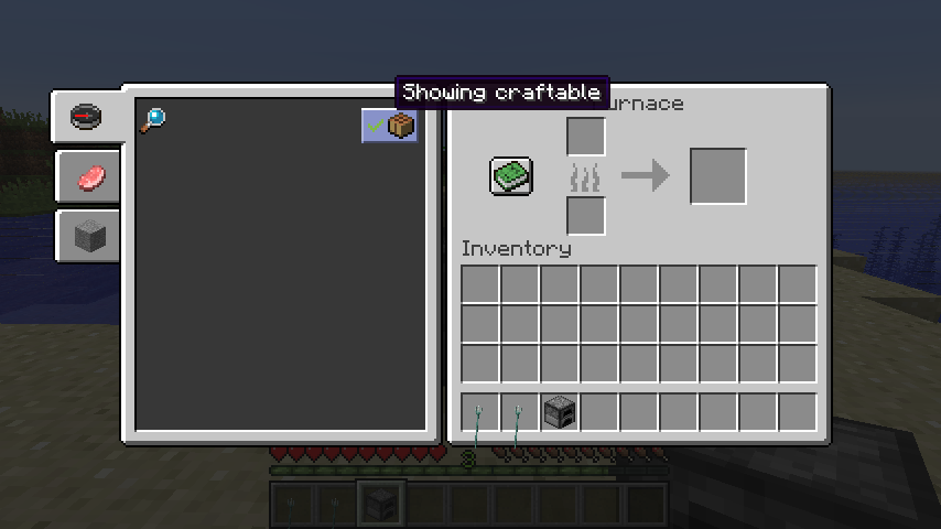 I think that the text is wrong because you are not crafting. You are smelting. It would make sense if it says "Showing smeltable" or "Showing cookable" rather than "Showing craftable." Also, instead of the crafting table icon on the filter button, why not a furnace icon?