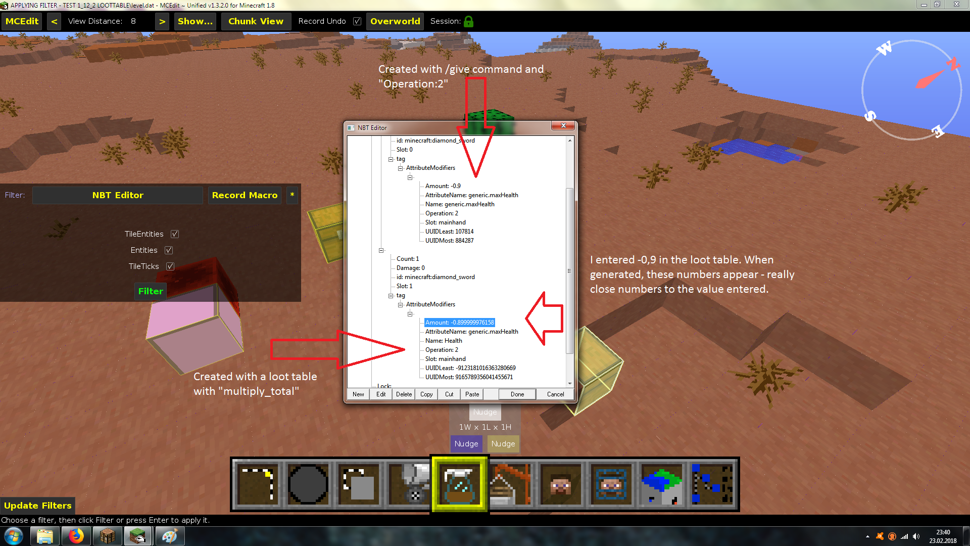 PROBLEM: It shows 2 hearts, bcs the code likes for some reason to change your amout you enter to a really close one. Example here: I entered "-0.9" and when the loot was generated, the item had an amout of "-0.899999..." (Look at the SCREENSHOT here.)