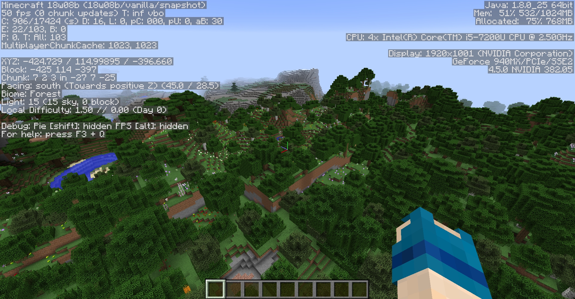 The other picture shows the exact same seed updated to 1.13 Snapshot - Notice NO Flowers and the Biome changed, even though the coords are the exact same.