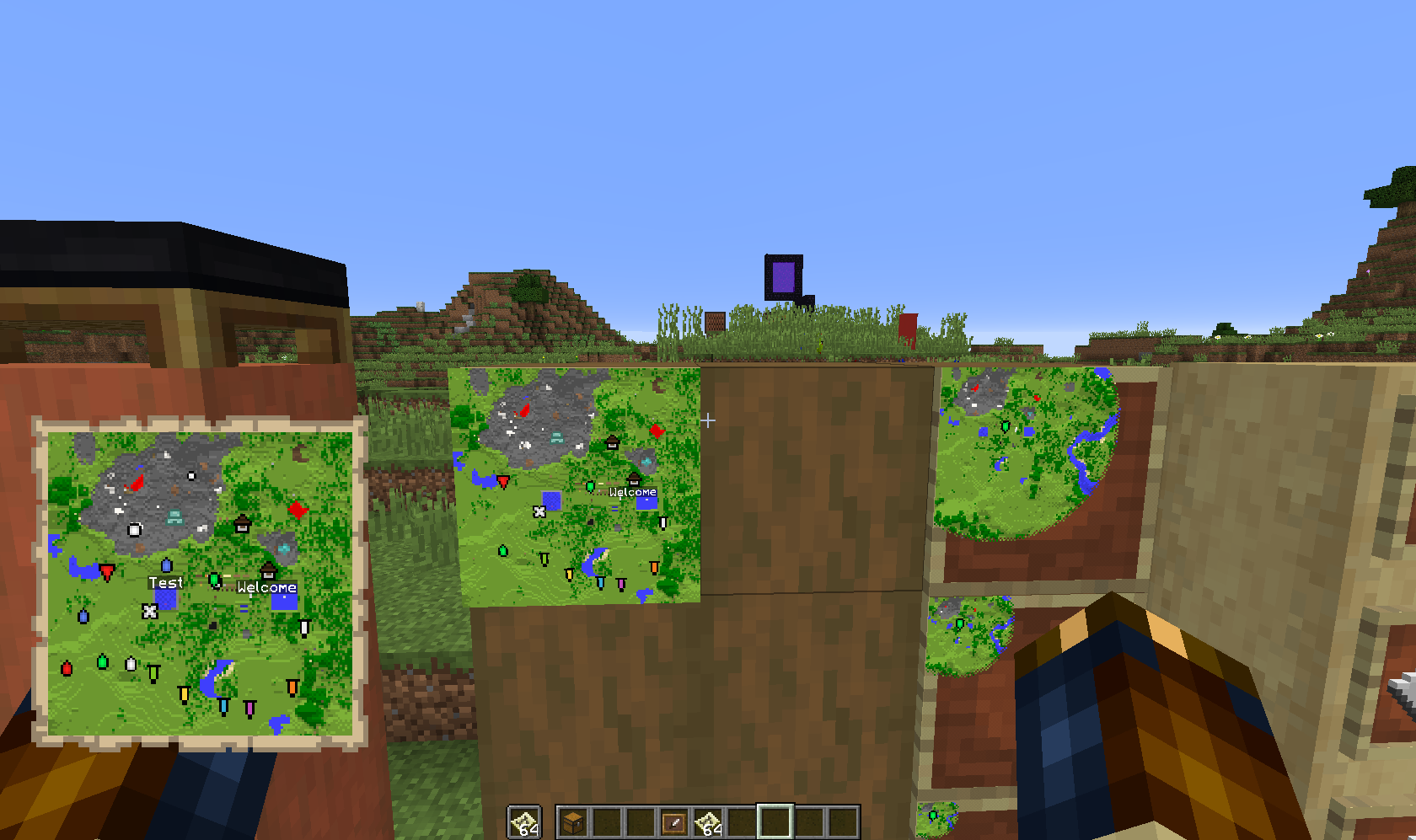 What I did here: I like to maintain a "teleport wall" with interesting places. Here I've copied the map ("pick click") I placed a named & colored banner and marked it on the map. As a result the banner shows on both maps, but as you can see the "framed map" doesn't show the cyan text nor does the banner appear in the fully right color.