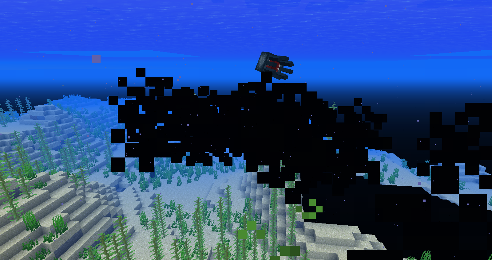 In recent snapshots, squids have been changed to be similar to their Bedrock counterparts in that they spew ink when damaged. However, unlike the puff it is in Bedrock, in Java edition it appears the ink particles spawn lopsided or sideways.