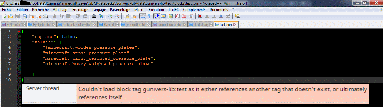 When creating a block tag in a datapack, attempting to extend a built-in block tag list with the minecraft prefix throws an error. However, leaving out the minecraft prefix works fine.