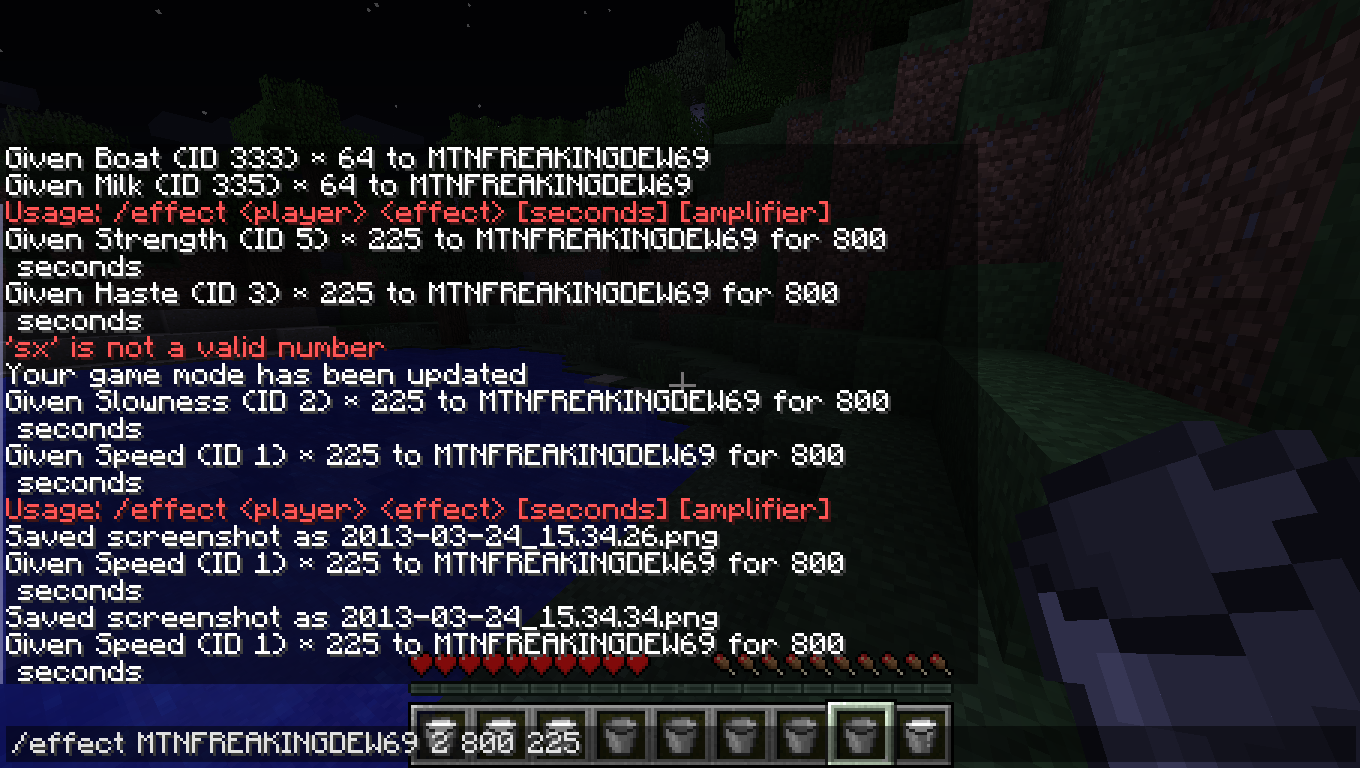 3. if you type /effect yourminecraftusernamehere 2 800 255 it gives you super speed (it should be slowness)