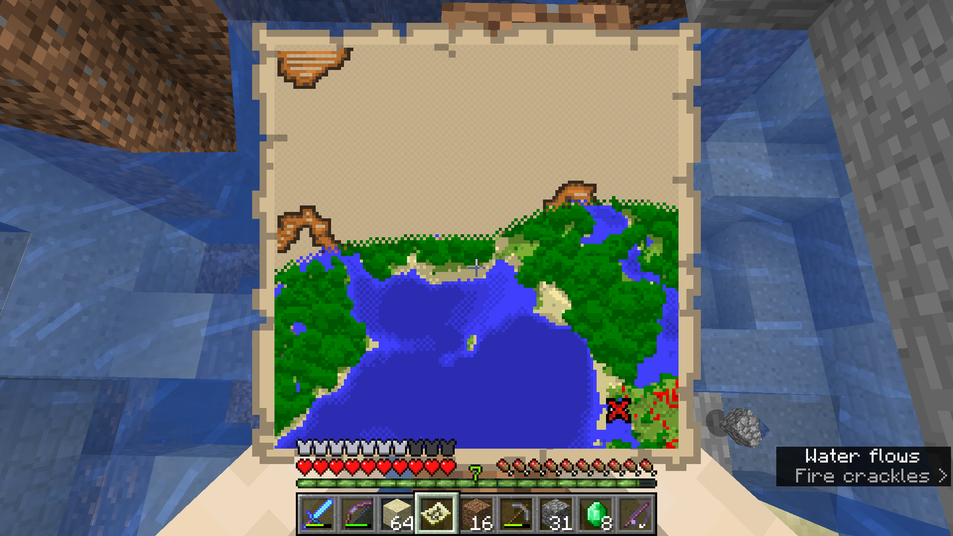 I found a buried treasure map, and tried to find the buried treasure in Survival, but I couldn't find it although I have dug down like 5 blocks to the stones and sandstones and about 5 blocks around the red cross. However, I found a dungeon below the red cross, and it might cause the chest not to generate properly. I have attached screenshots of my map, and the dug area around me.