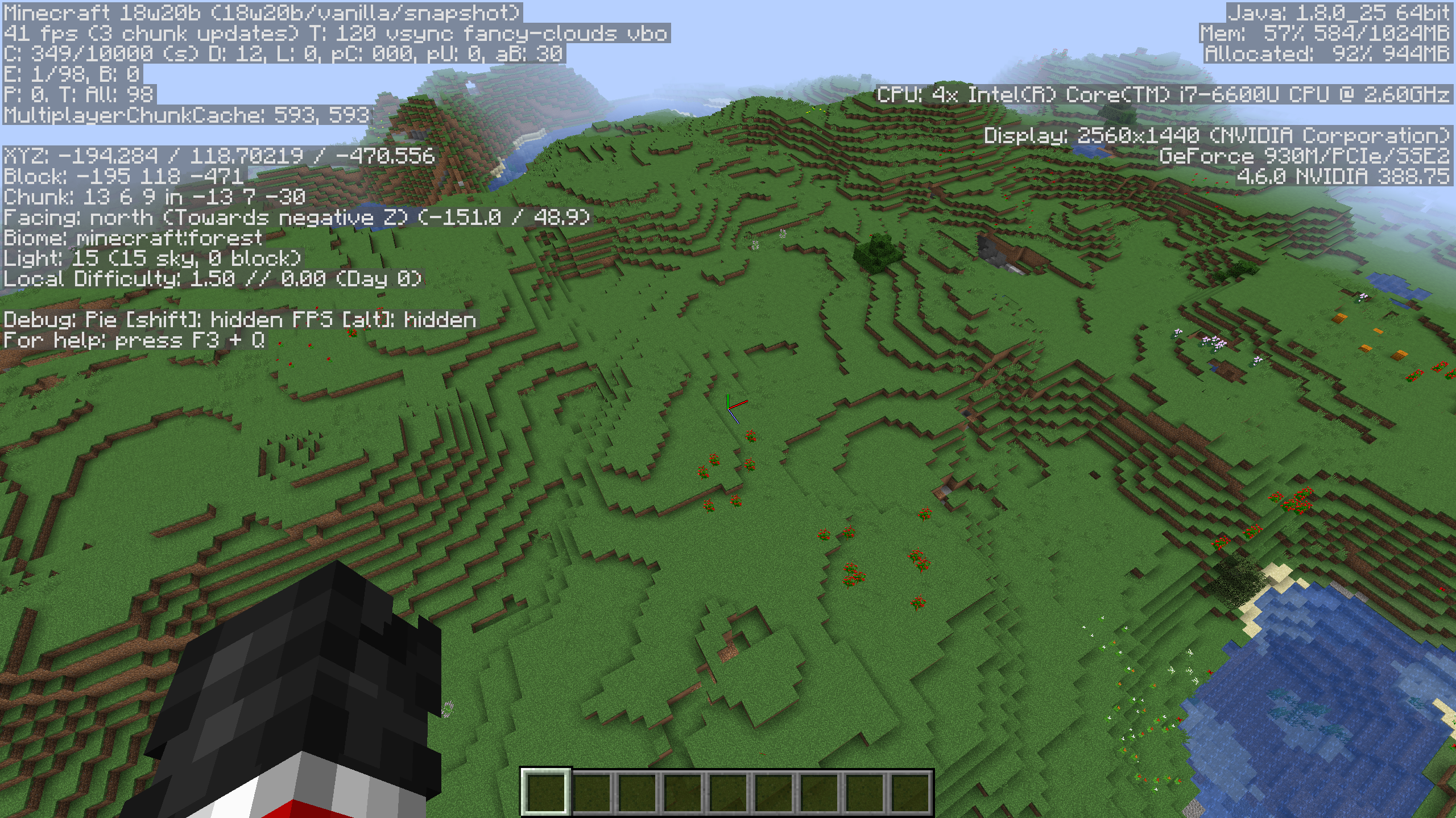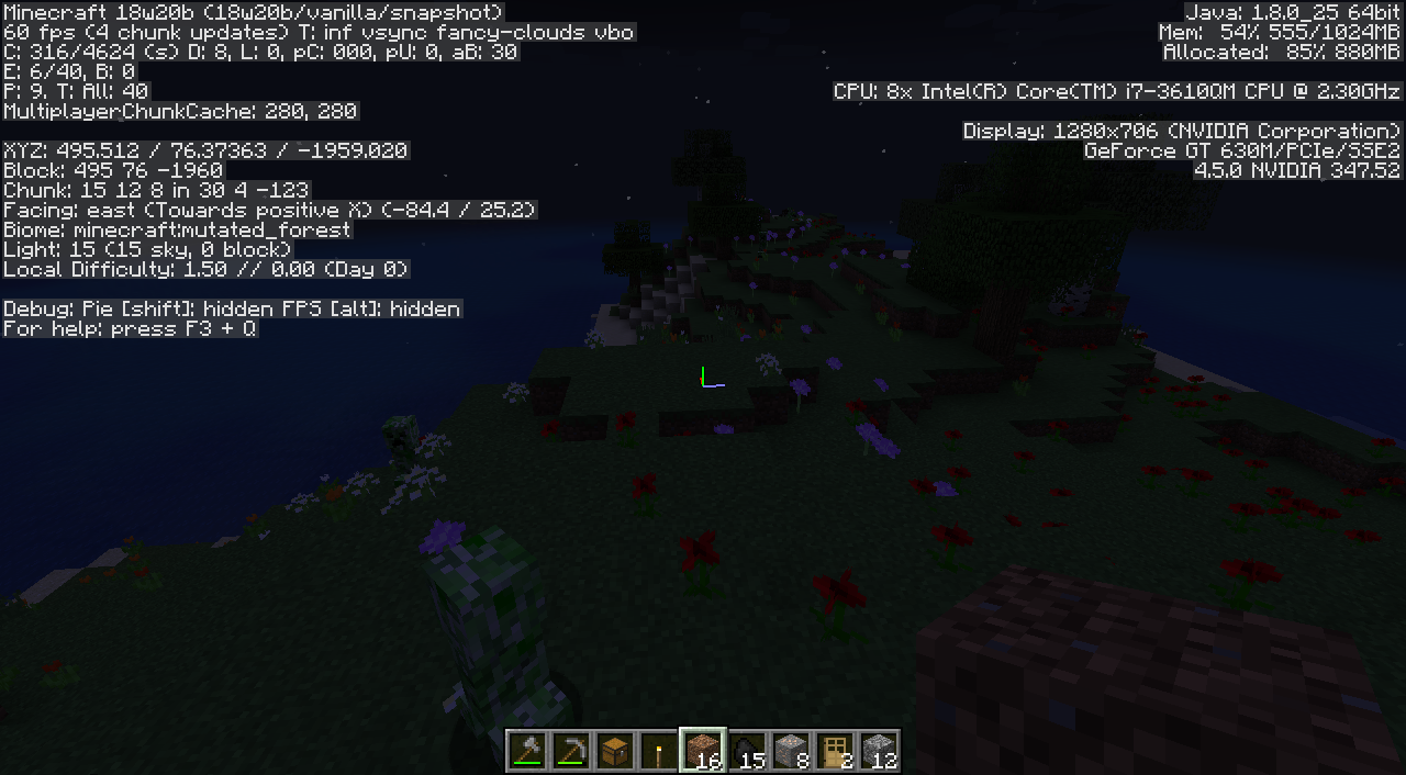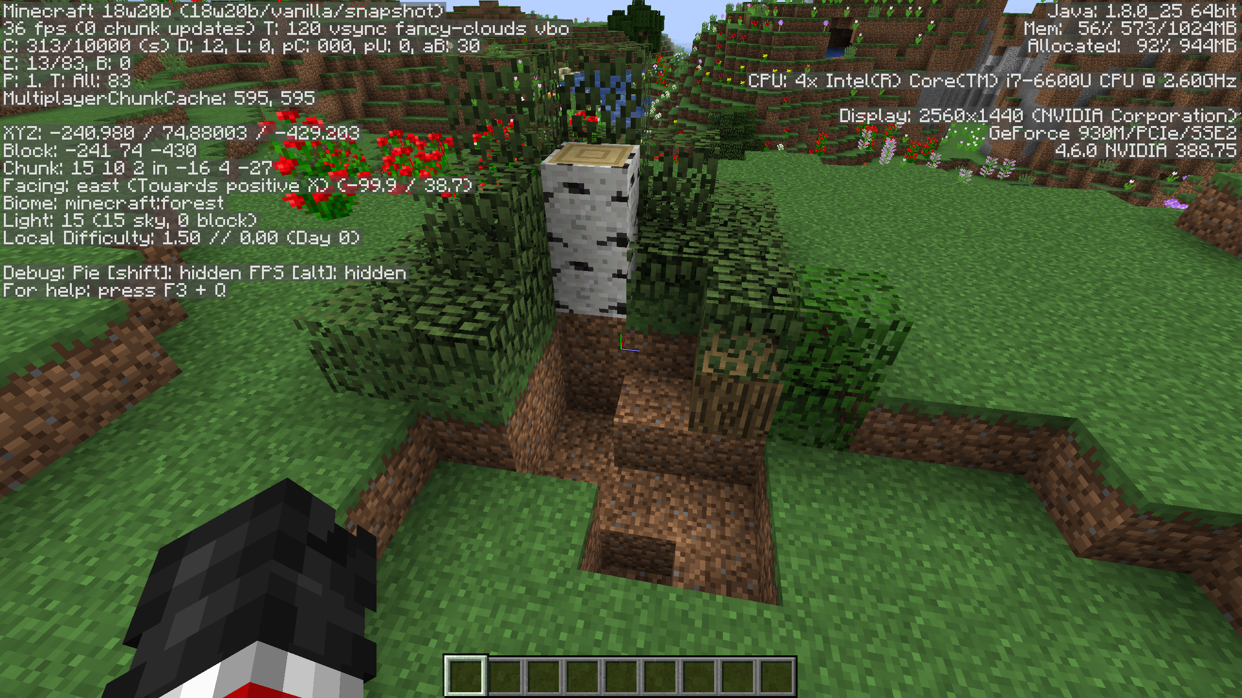 In 18w20b, trees are generating in the ground or not at all. The biome is shown in the screenshot. Affects forest, swamp, roofed forest, taiga, jungle, etc. Either it does not affect extreme hills with trees, or trees randomly decide to generate. But when I am flying by trees that generate there is extreme generation lag. This also appears to affect underwater plants like kelp and sea grass.