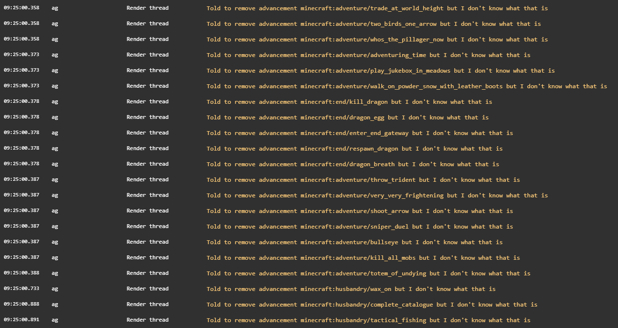 Additionally, the warning message is triggered by again, Mojang spaghetti code. Sometimes when removing linked advancements, it'll attempt to remove one twice, which causes this warning.