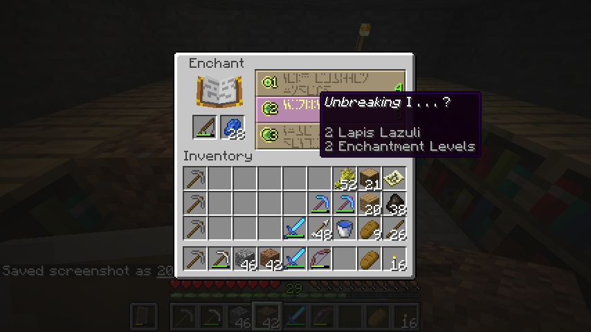 Hard to see something that's not there. The 44.22 photo is with my cursor over the first / top level and it doesn't light up. The 53.05 photo is with my cursor over the first / top level, but this time with lapis in the box. As you can see the "foreign" words show up, but no English translation box. The 53.12 photo has cursor on the middle enchantment level, and has the "foreign" words and the English translation box with enchantment name.