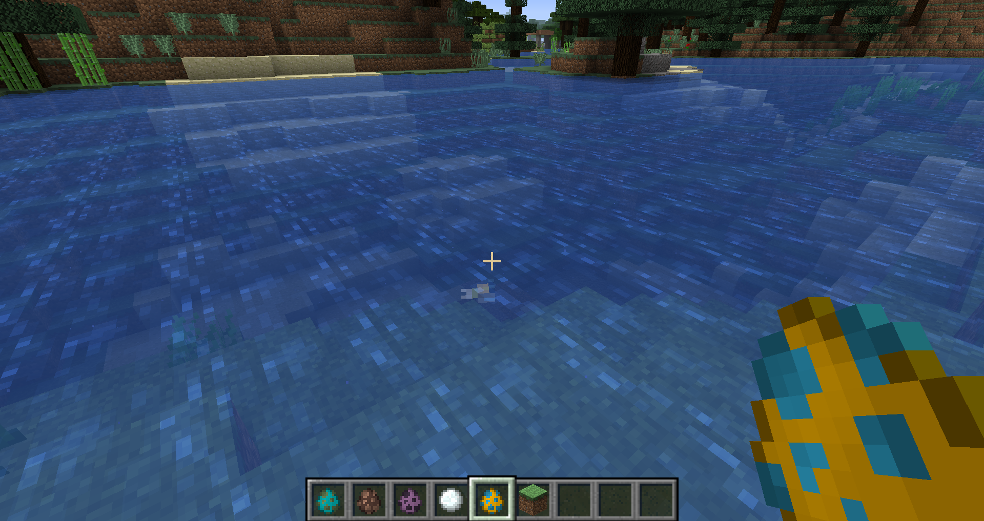 If a spawn egg is used on water sufficiently deep so that the water is targeted and not any blocks under it, the mob is spawned successfully but the hand does not display any animations. If a block is targeted instead, the hand will move.