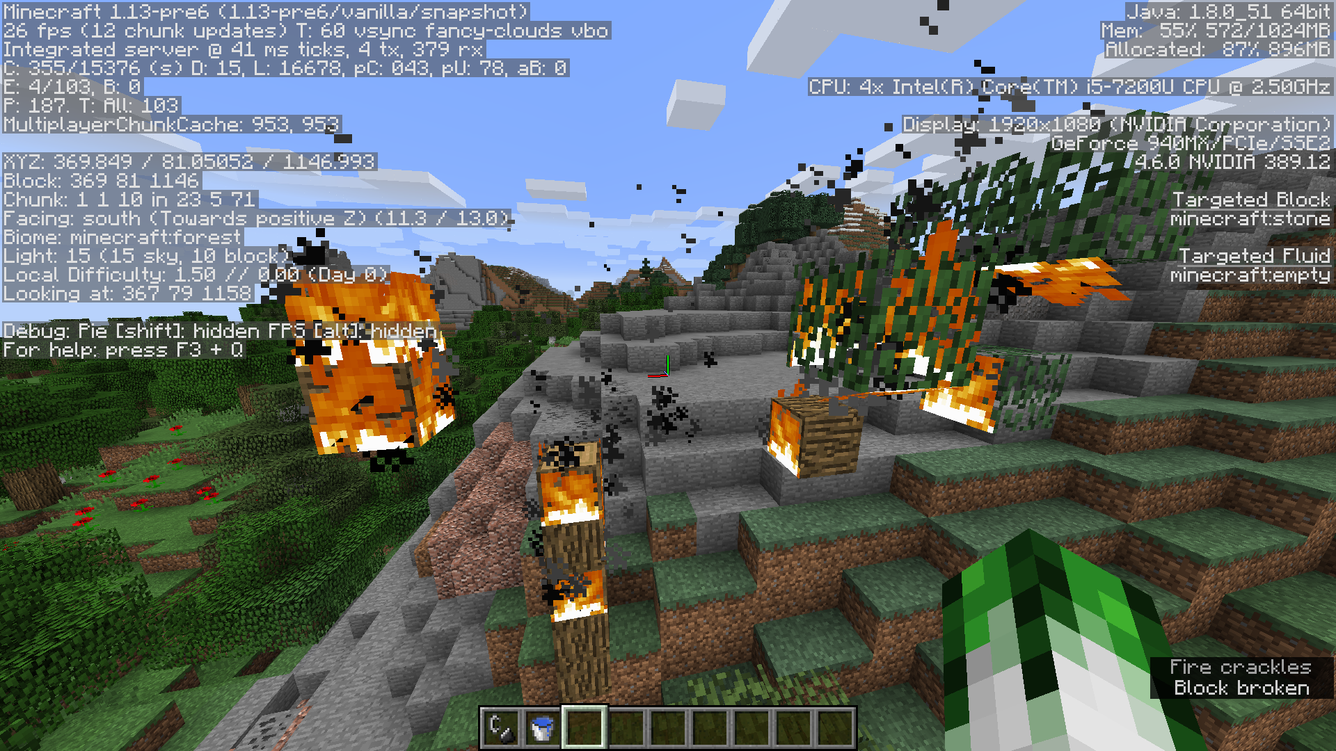 if a tree burns in 1.13(pre6) and blocks "disappear" they make a sound like wool or smth like that. In 1.12 for example the only sound you hear is the firesound and the blocks just disappear. (In the screenshots you can see in 1.12 you only have fire sound and 1.13 you have fire and block breaking sound.)