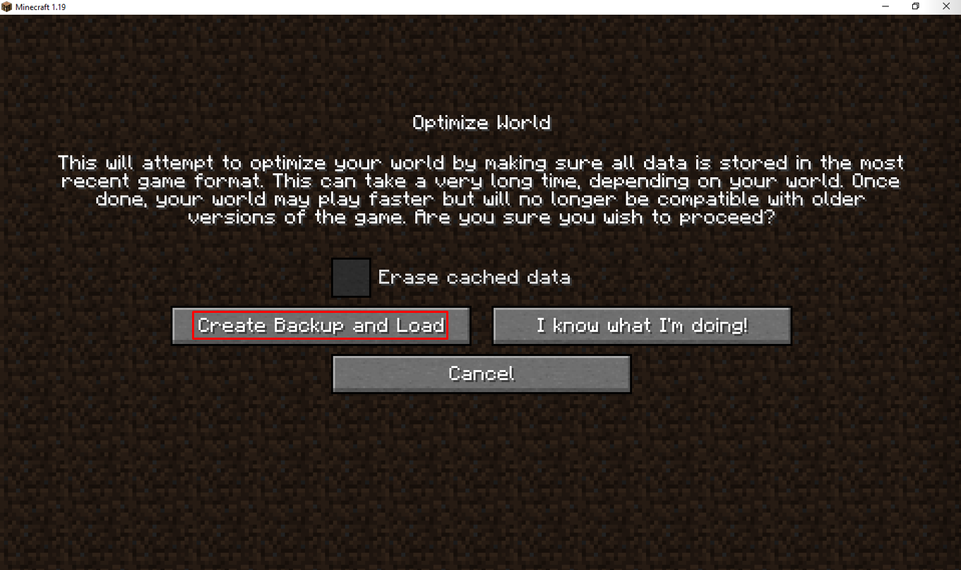 The button on the "Optimize world" window for creating a backup and optimizing the world has the text "Backup and load", which appears to be the same text which is used when opening a world in a newer version.
