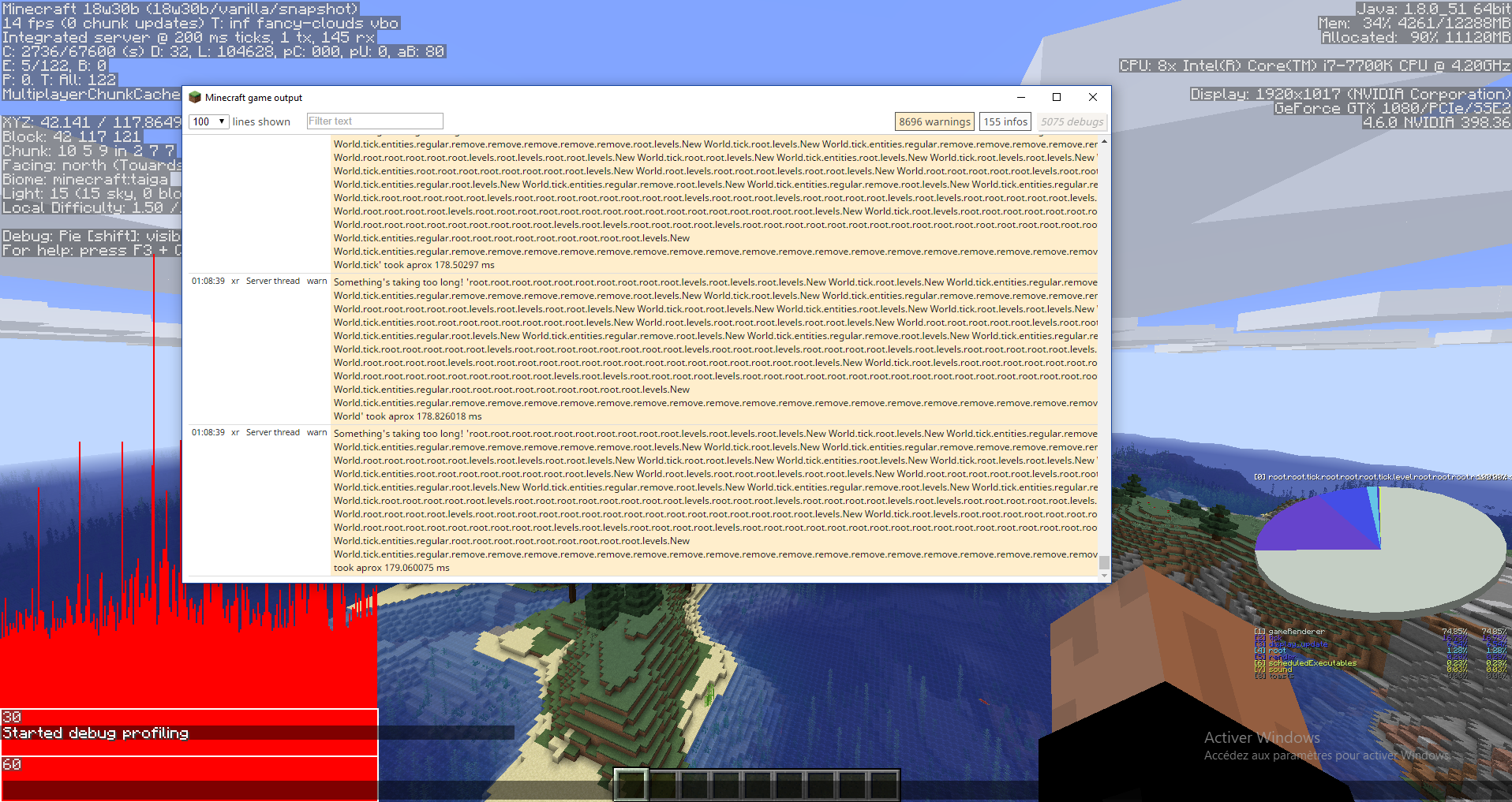 extreme lag occurs in newly created world, and when opening the debug pie, you can dive infinitely in "root.root.tick.root.root.root.tick.level.root.root.root.root.tick.root" (chose always "root", or if there is no "root", then chose "tick")