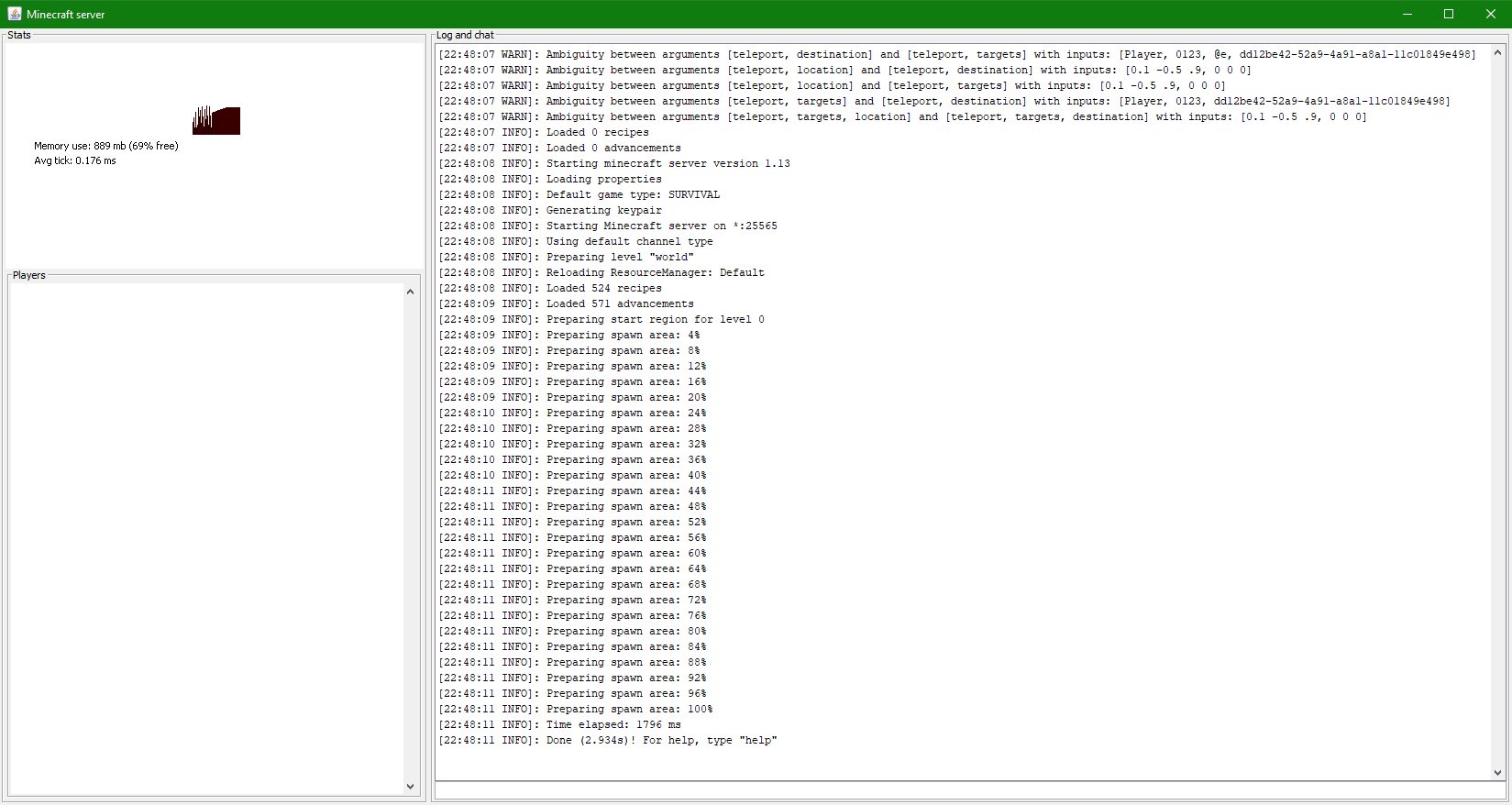 Also, at the start of this, the server will throw 5 warnings of ambiguity between the various teleport commands. The memory usage here at the start also looks different from past versions. Not sure if this is expected or not but see serverOutput1.png