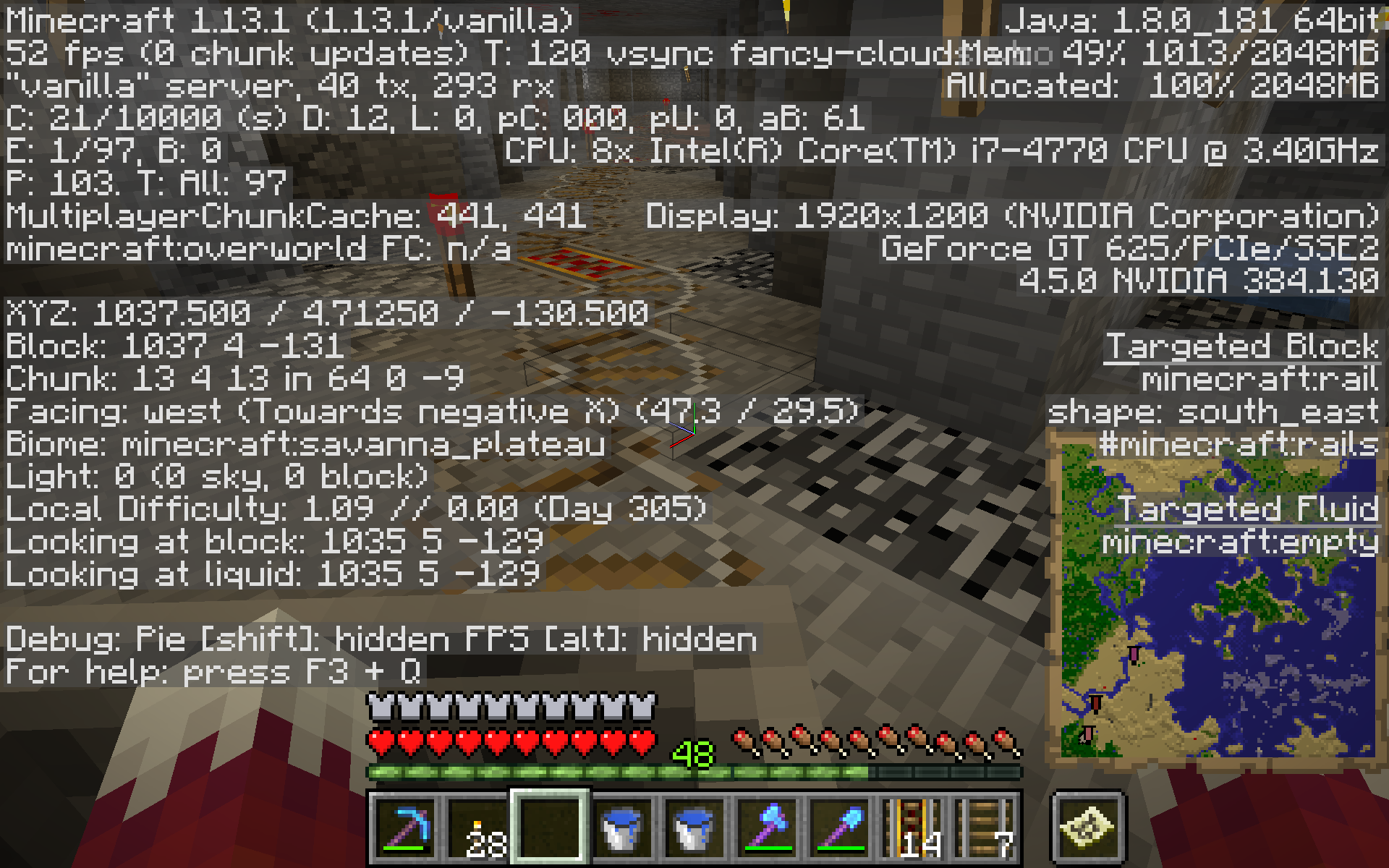 There is a junction ahead (right/left/left/right, keeping me on the same z=-108 line) and after those curves, I am centered in the minecart.