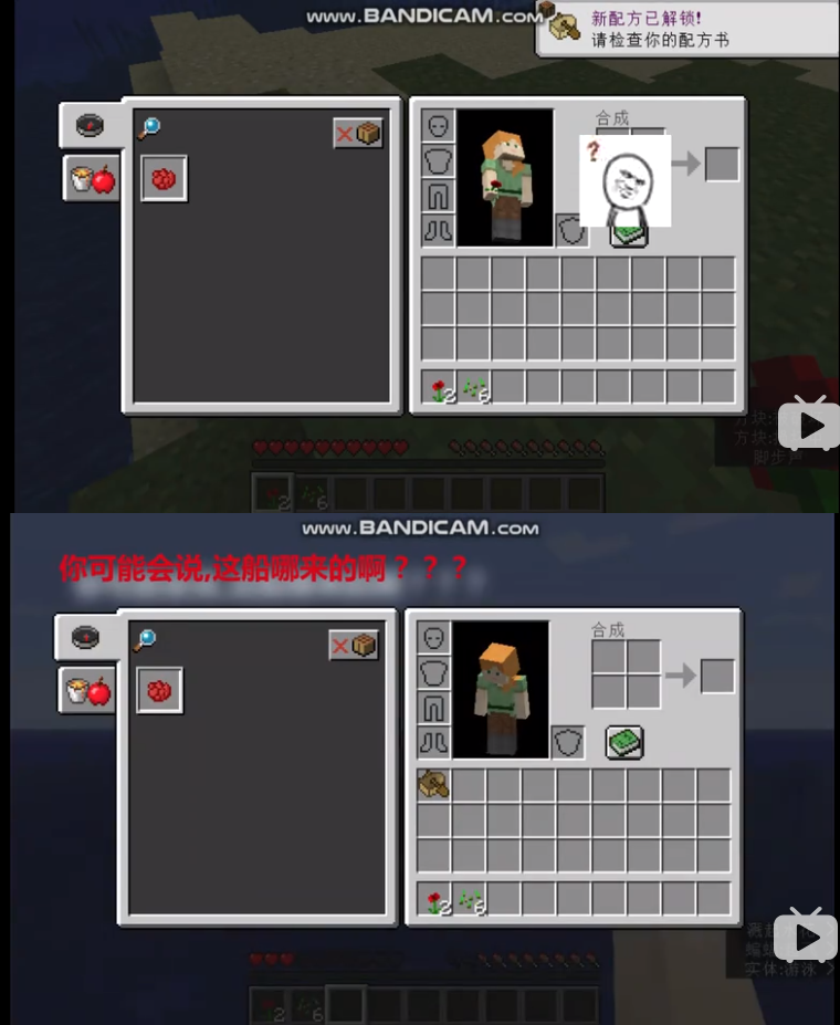 The player unlocked the boat's recipes as soon as he fell into the water and popped up a notification, then he immediately opened the Inventory. When the player opens the inventory again, a boat is added to his Inventory.