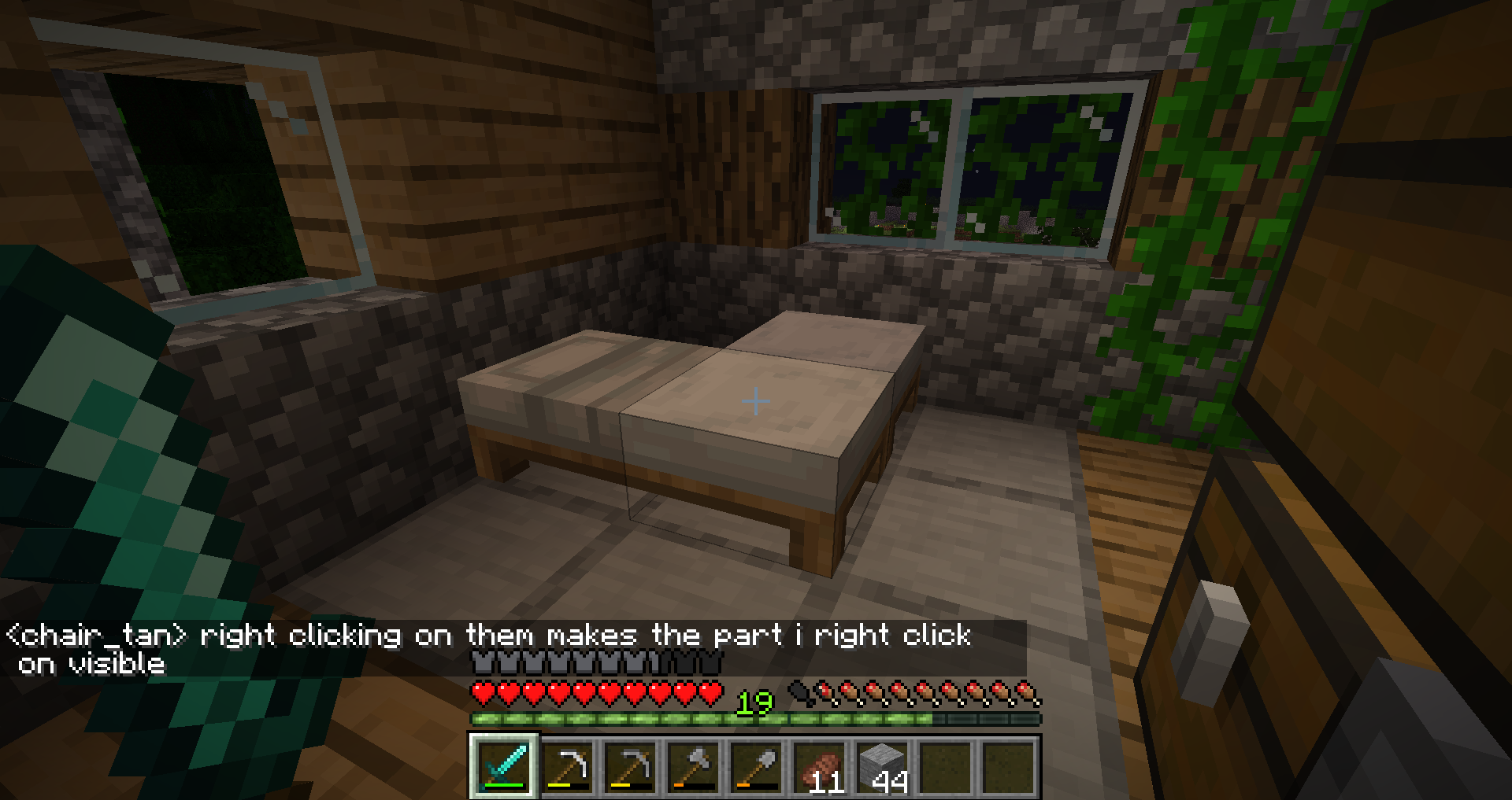 Logging back into the server caused the entire server to crash, after opening the server and logging in, I noticed that the two beds near me appeared to be invisible, after right clicking on a part of the bed and laying in it, that part of the bed became visible again, as shown in the image, with only one and a half beds visible.