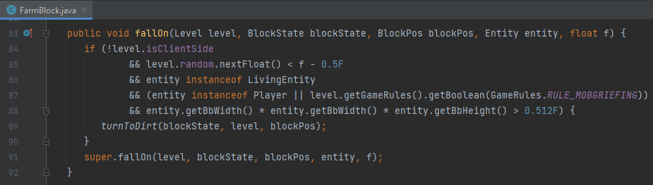 ...If we look at the above class, we can see that there is only one necessary check that's carried out before allowing players to trample farmland. This check is to quite simply see if the entity falling on the farmland is a player. If it is, the farmland can be trampled if the other requirements within the "if" statement are met. The game doesn't check to see what abilities the player possesses (what game mode they are in) before allowing them to trample farmland, therefore resulting in this problem occurring.