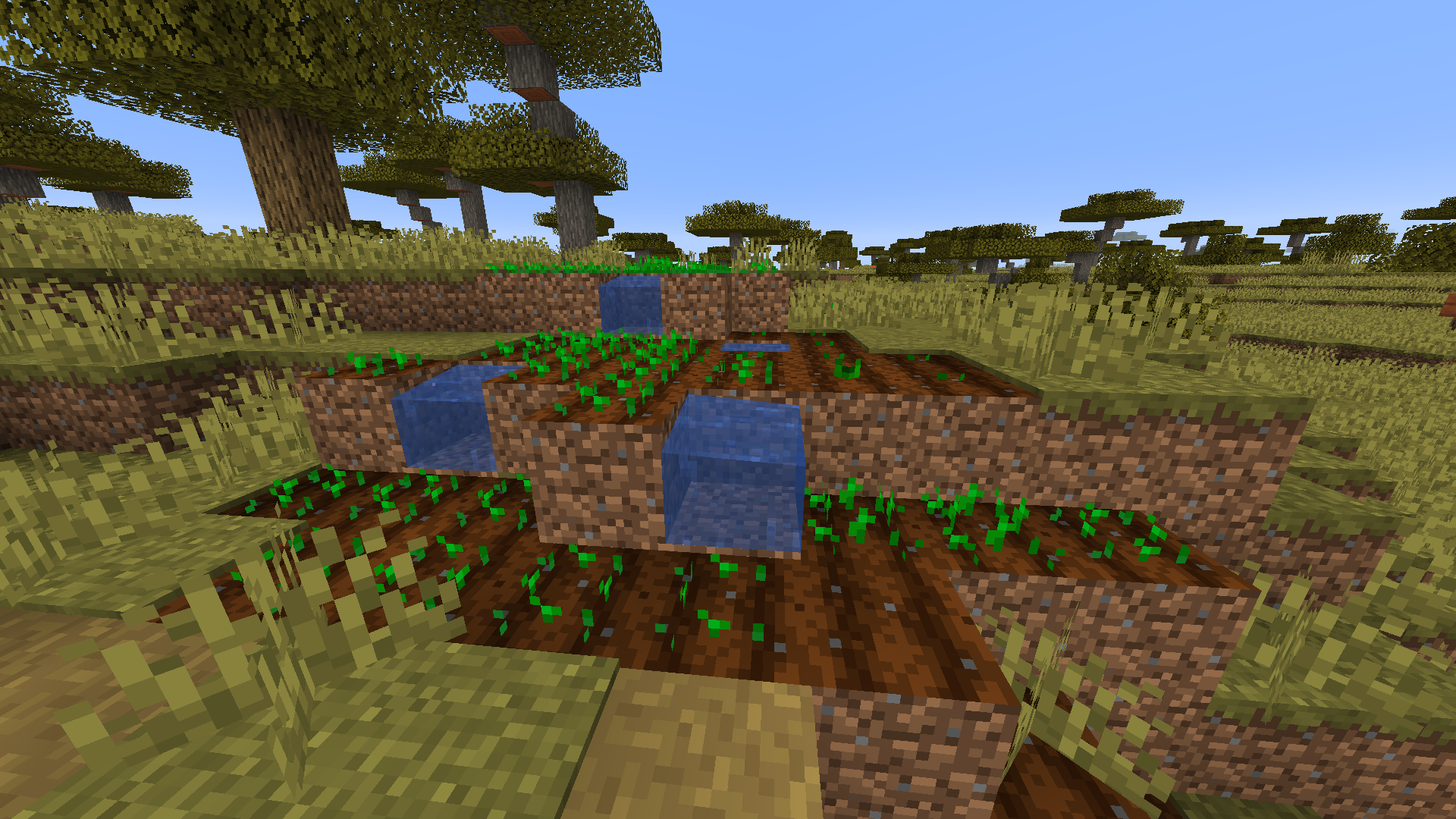 This issue is specific to savanna village farms since these farms follow the terrain when generating, thus sometimes exposing the water. The water doesn't tick at first so it just remains still, but once the crop ticks, it then causes the water flow, ultimately resulting in savanna villages on mountainous terrain being overrun with waterfalls.
