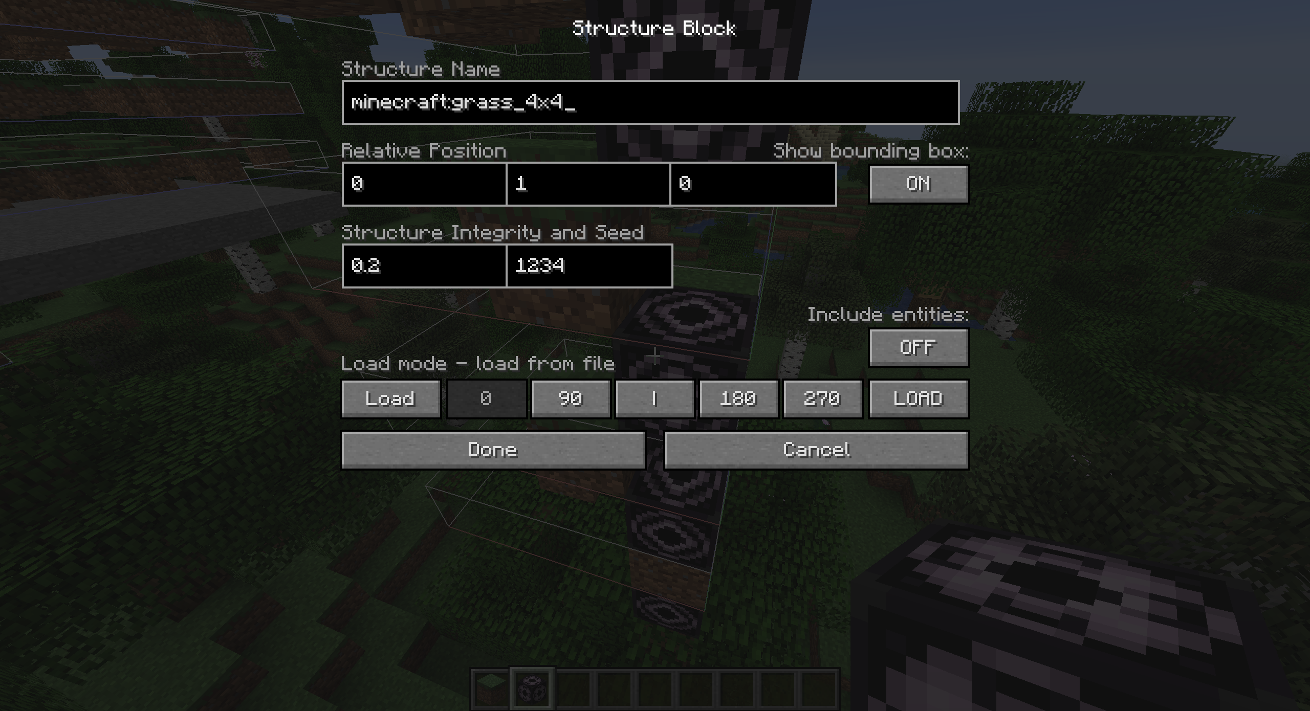 Save a 4x1x4 area of grass_block in a file named grass_4x4 (or minecraft:grass_4x4). Load the structure block twice in an open (vertical) space, both with an integrity of 0.2 and a seed of 0, and leave the rest default. Place three more structure blocks identical to the previous ones directly above the previous two, only changing the seed to 1234. Load all five. Then, the fifth structure block's relative y-position should be set to 2, and loaded again. Place a structure block two blocks above the fifth, identical to the previous three, only changing the relative y-position to -2. Load that, then set that value to -1.