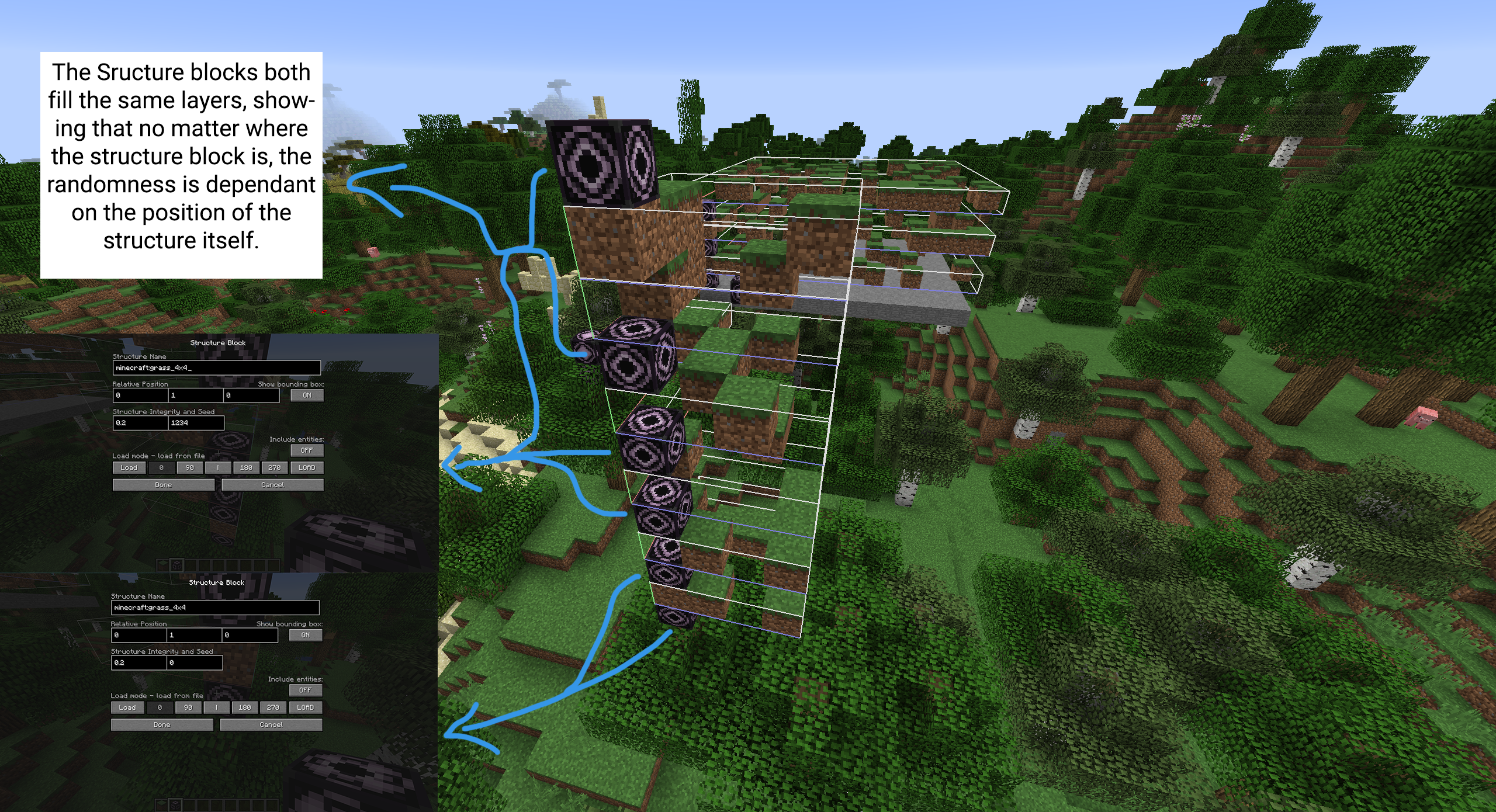 The first two structure blocks should be random, but it remains upon replacement. The next four do not share the same arrangement. The fifth and sixth blocks have different locations, but the randomness appears to be from the origin of the structure, as both of them generate both layers identical.